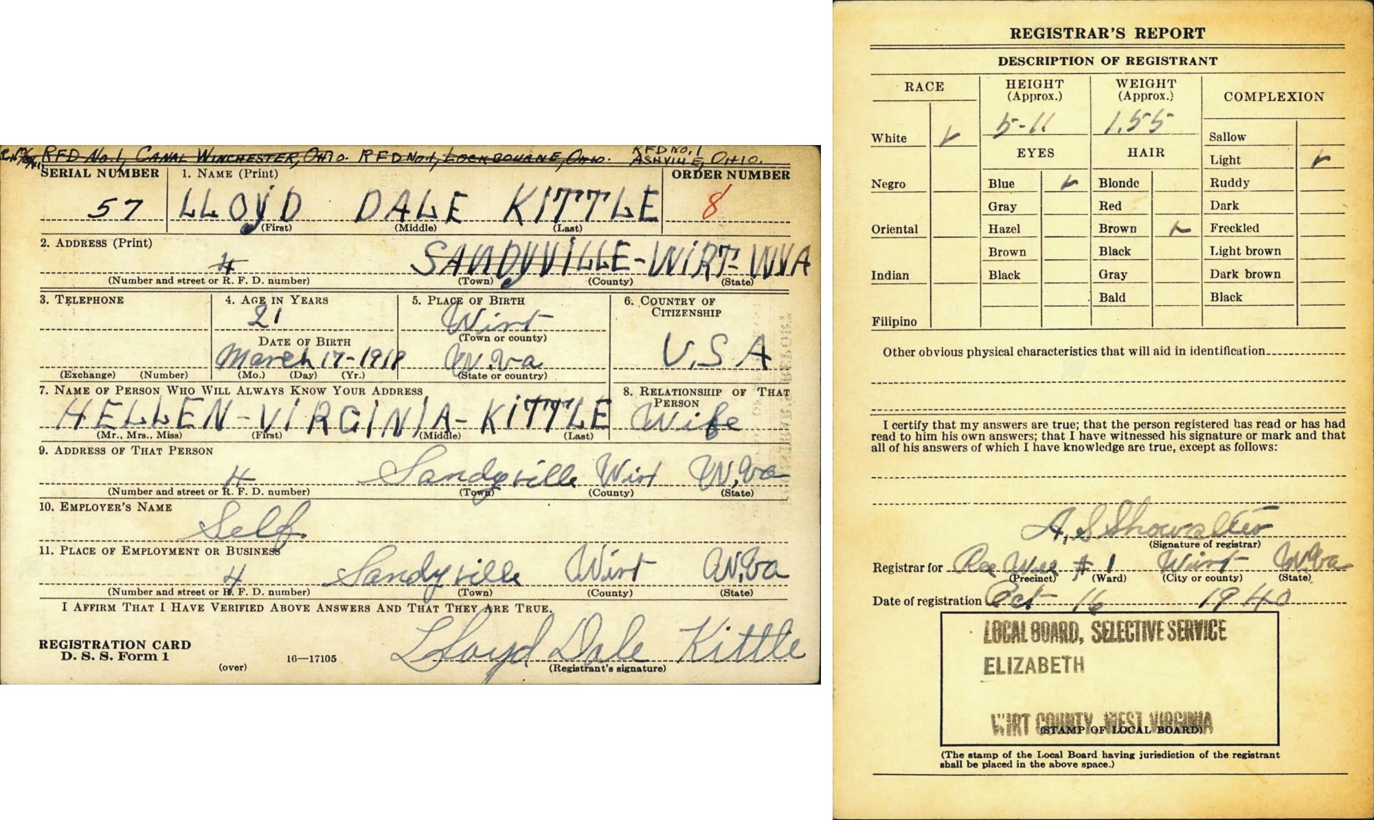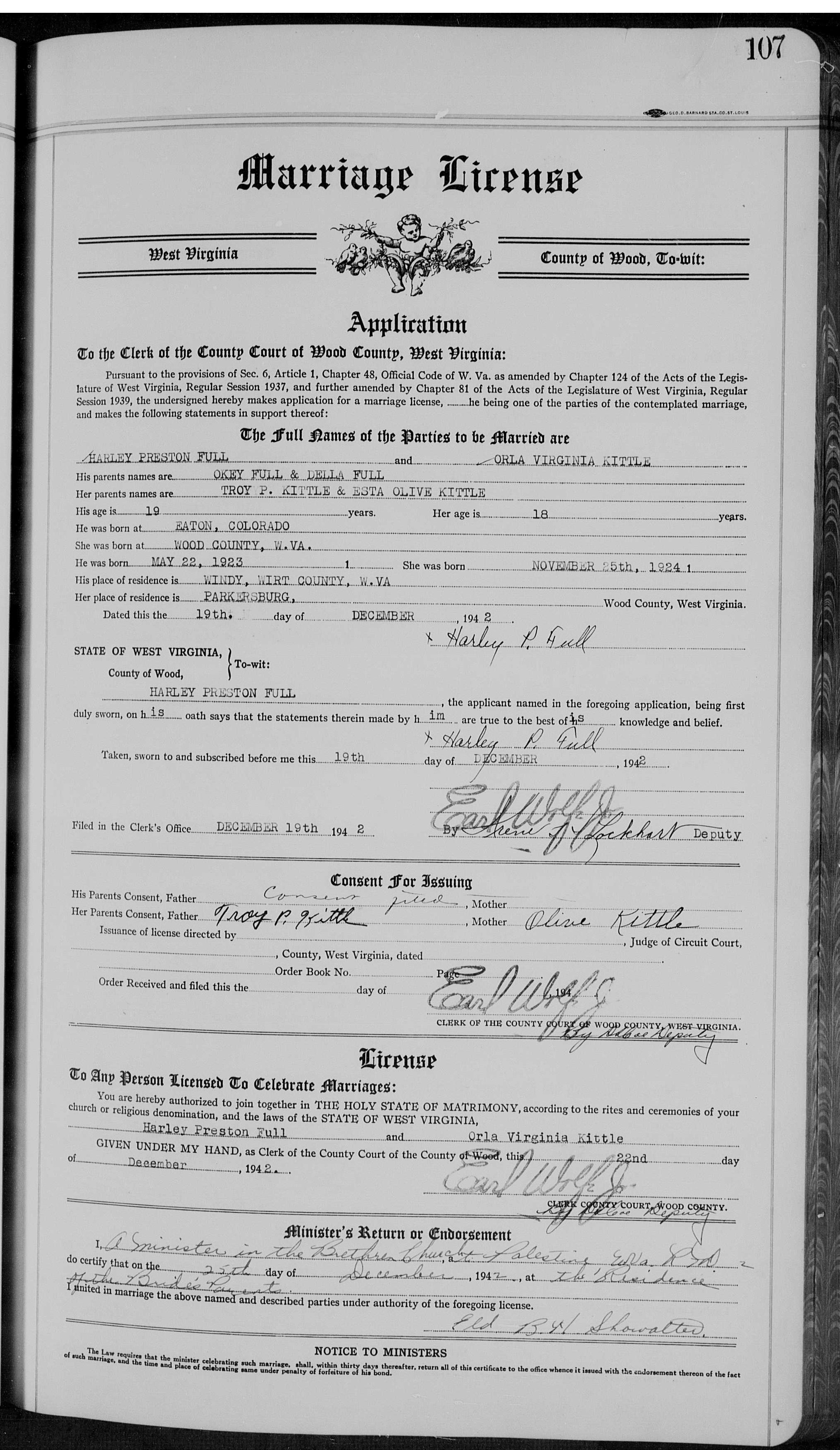 Marries Esta Olive Showalter, Mar 31, 1918, Wirt Co., WV |