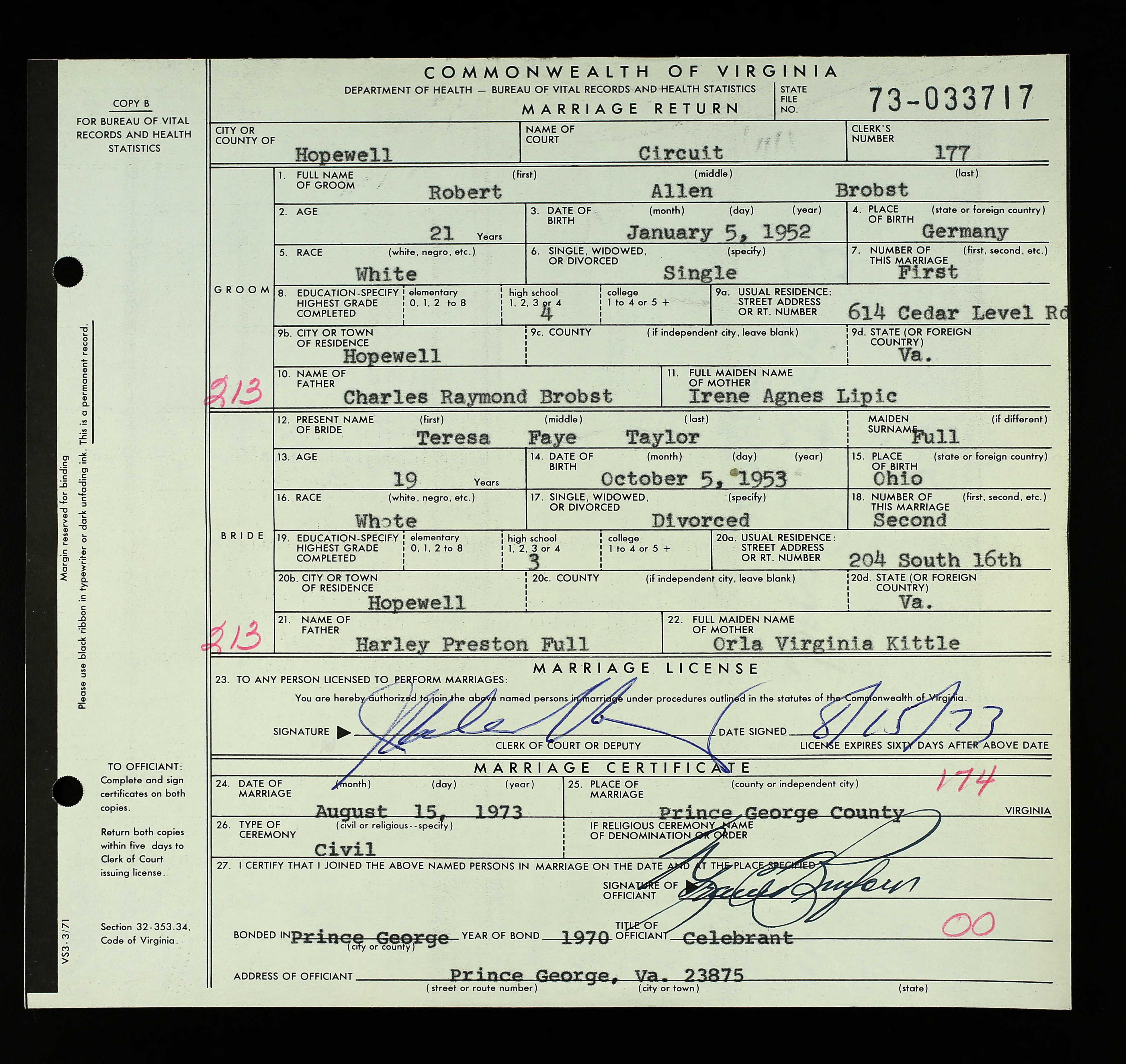 Bryce Earl Turner and Cindy Diane Conwell ) -