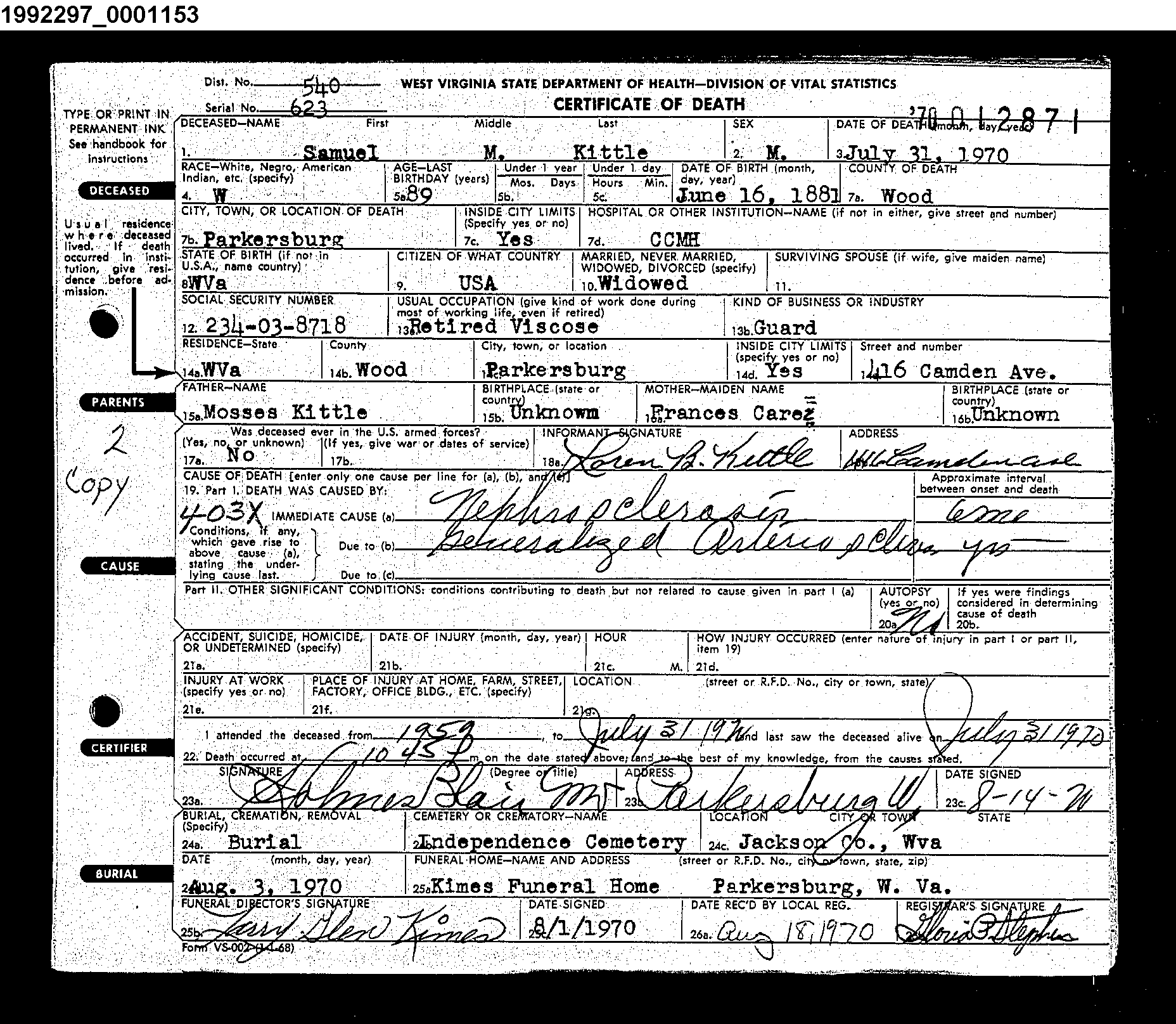 Home, Parkersburg, with the Rev. Lewis Villers officiating.