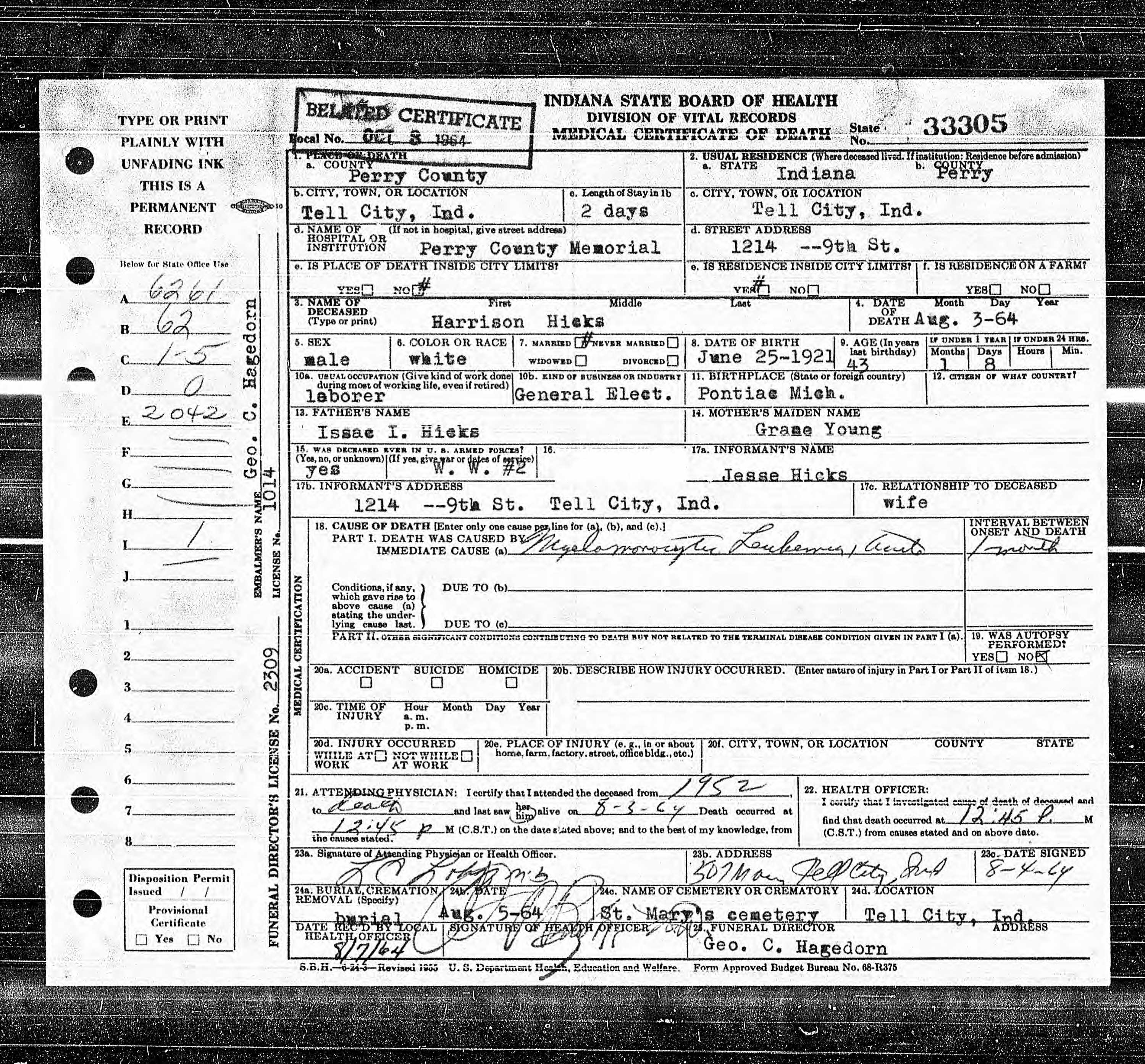 Dec 12, 1927, Tell City, Perry Co, IN; Jul 26,