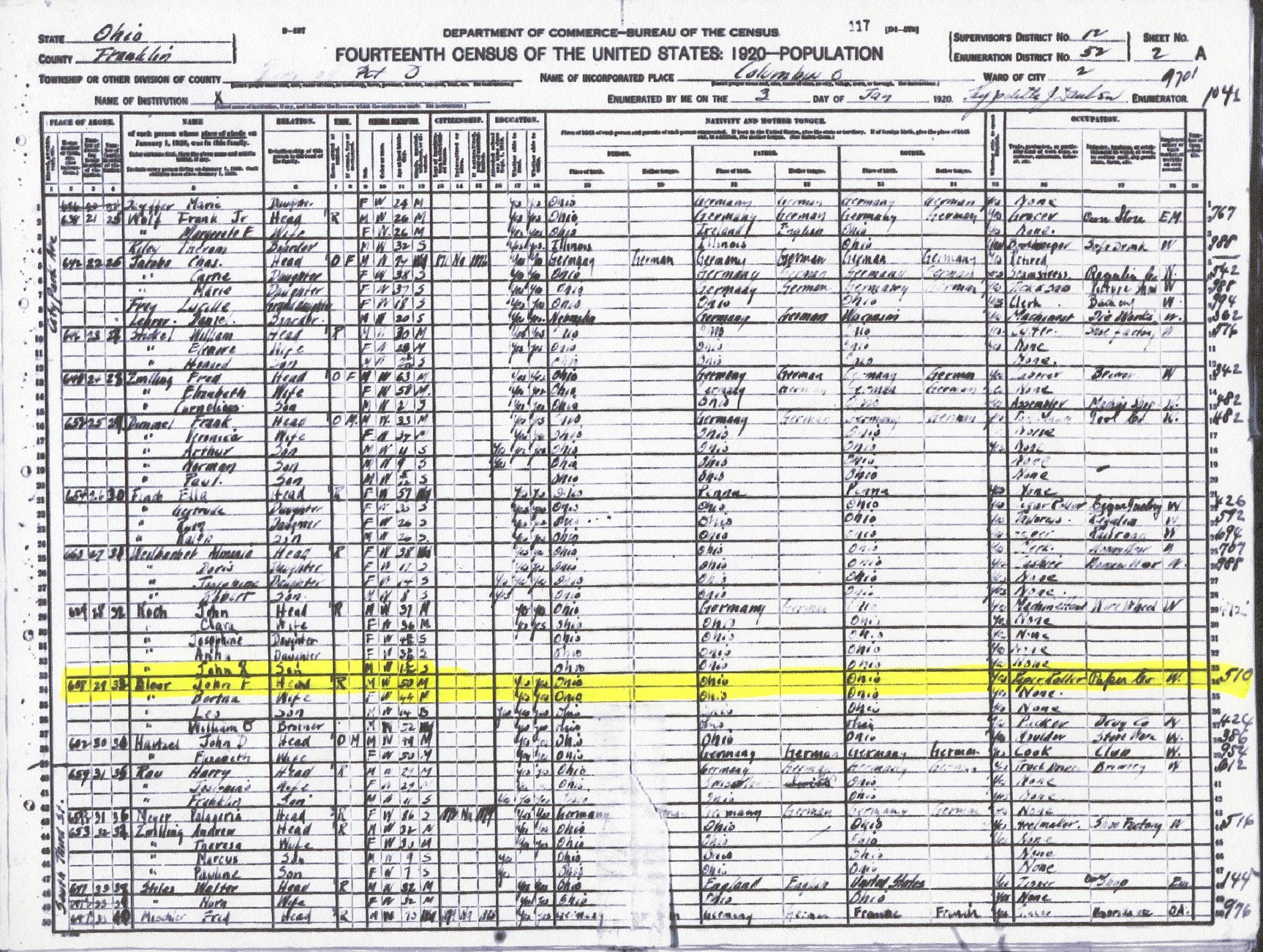 1920 Census for John Fletcher Bloor |