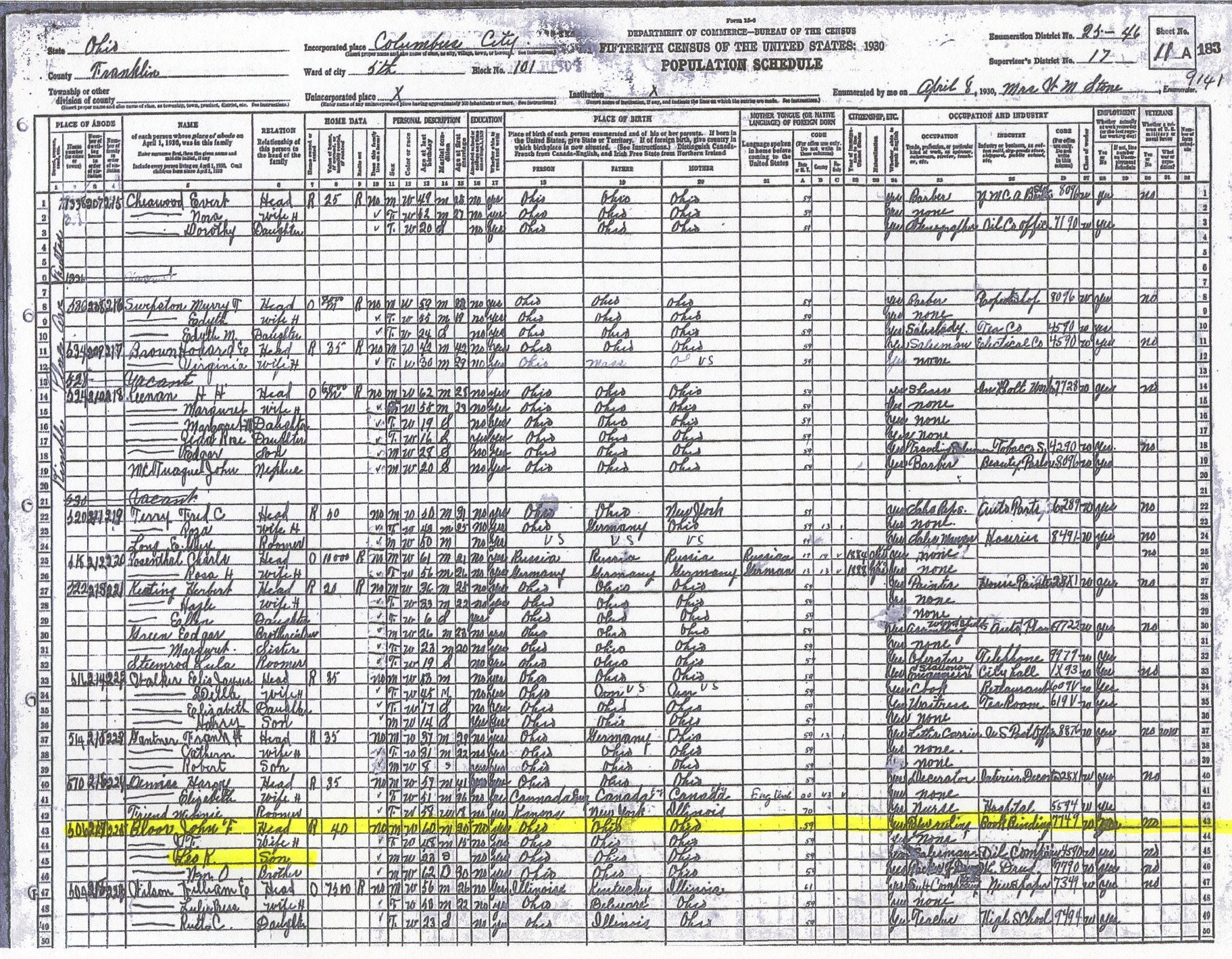 1930 Census for John Fletcher Bloor |