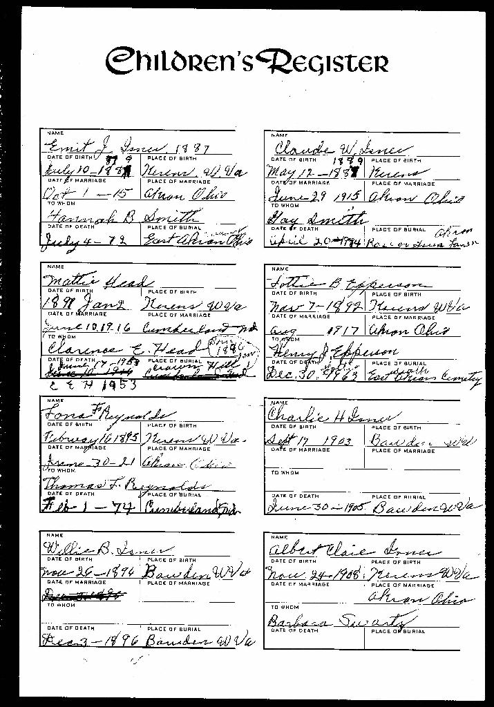 28, 1893, Braxton Co., WV, daughter of William Smith and Mary Hudkins; d. Dec 30 1985, Tallmadge, Summit Co., OH, SS# 271-62-6049)
