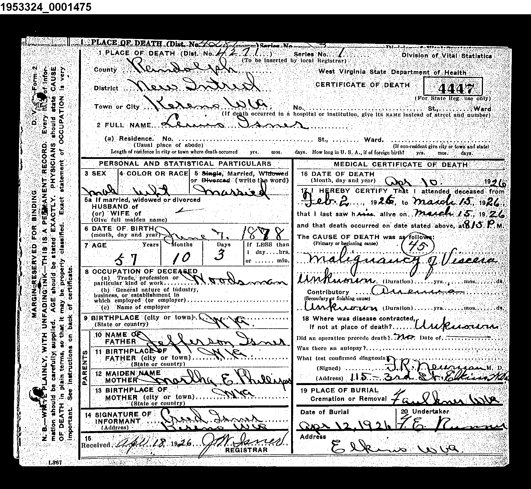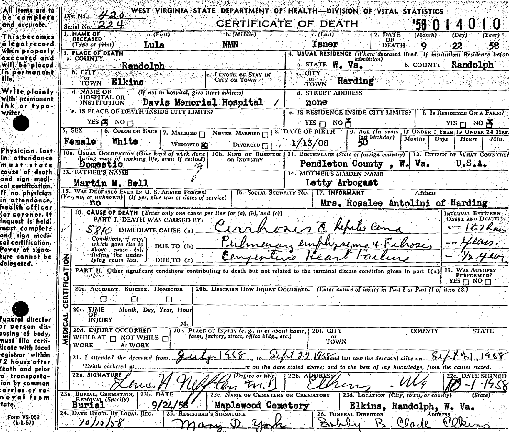 - b. Abt 1910, Elkins, Randolph Co., WV; d. Mar 27, 1964, Santa