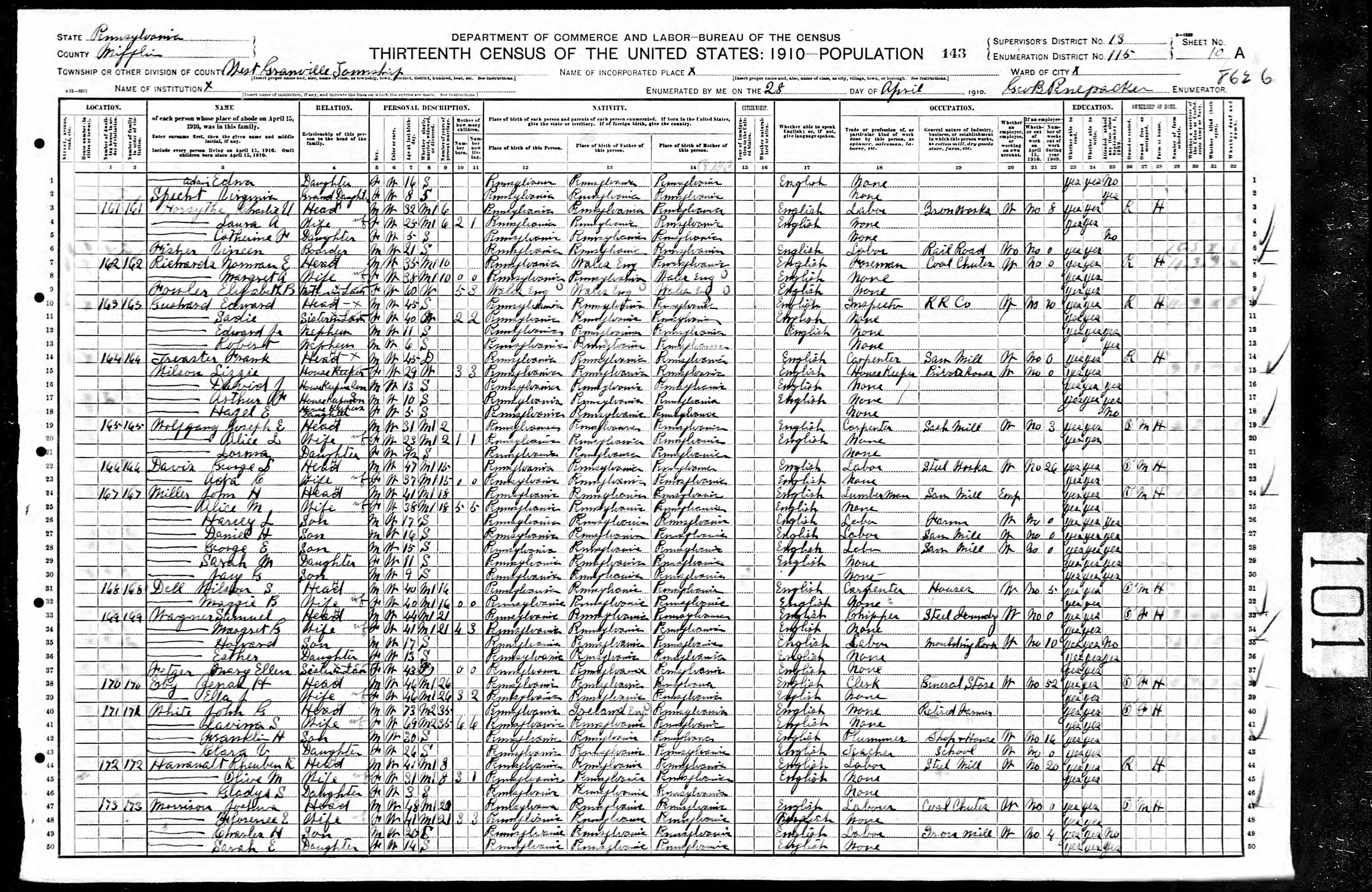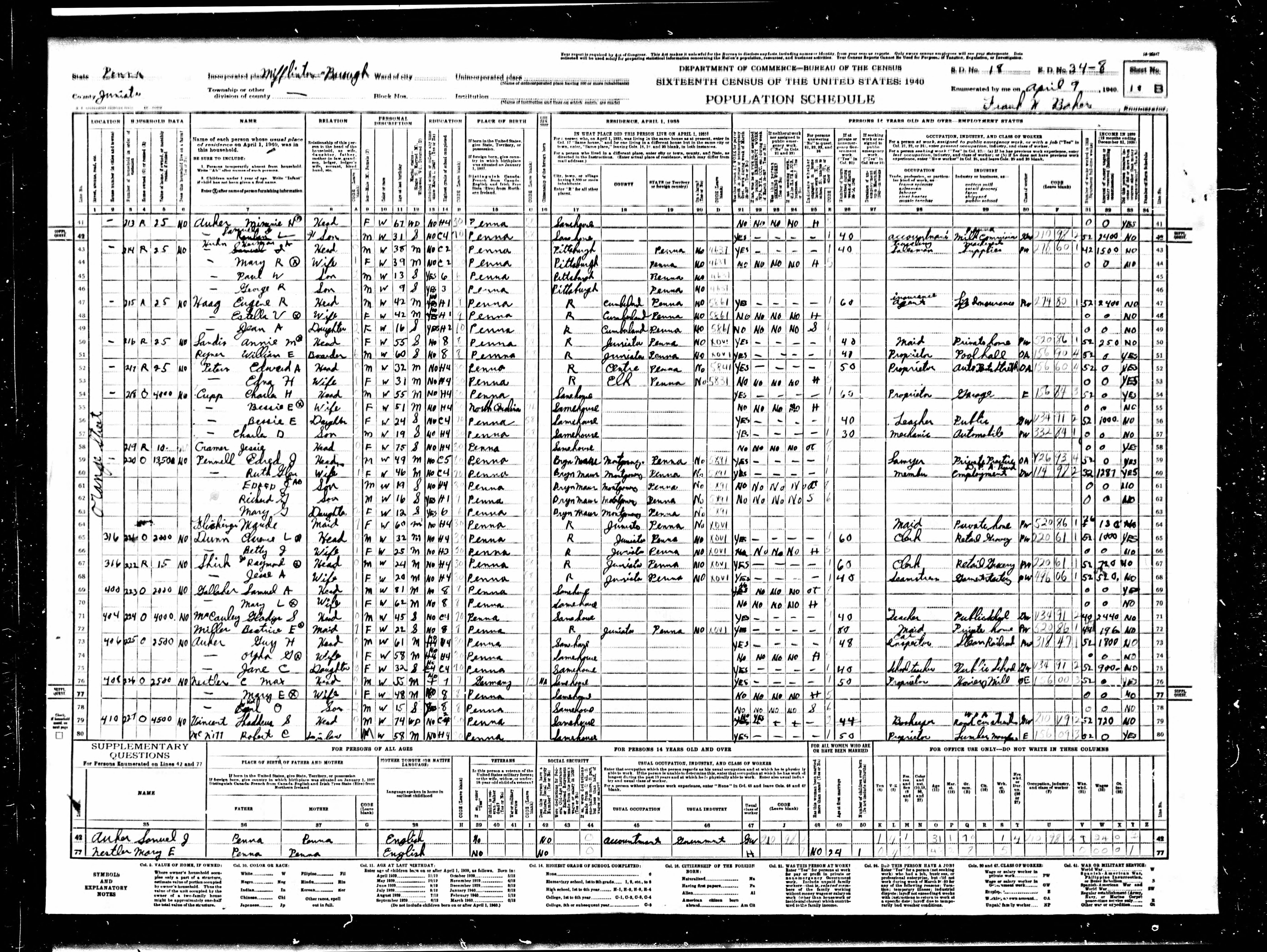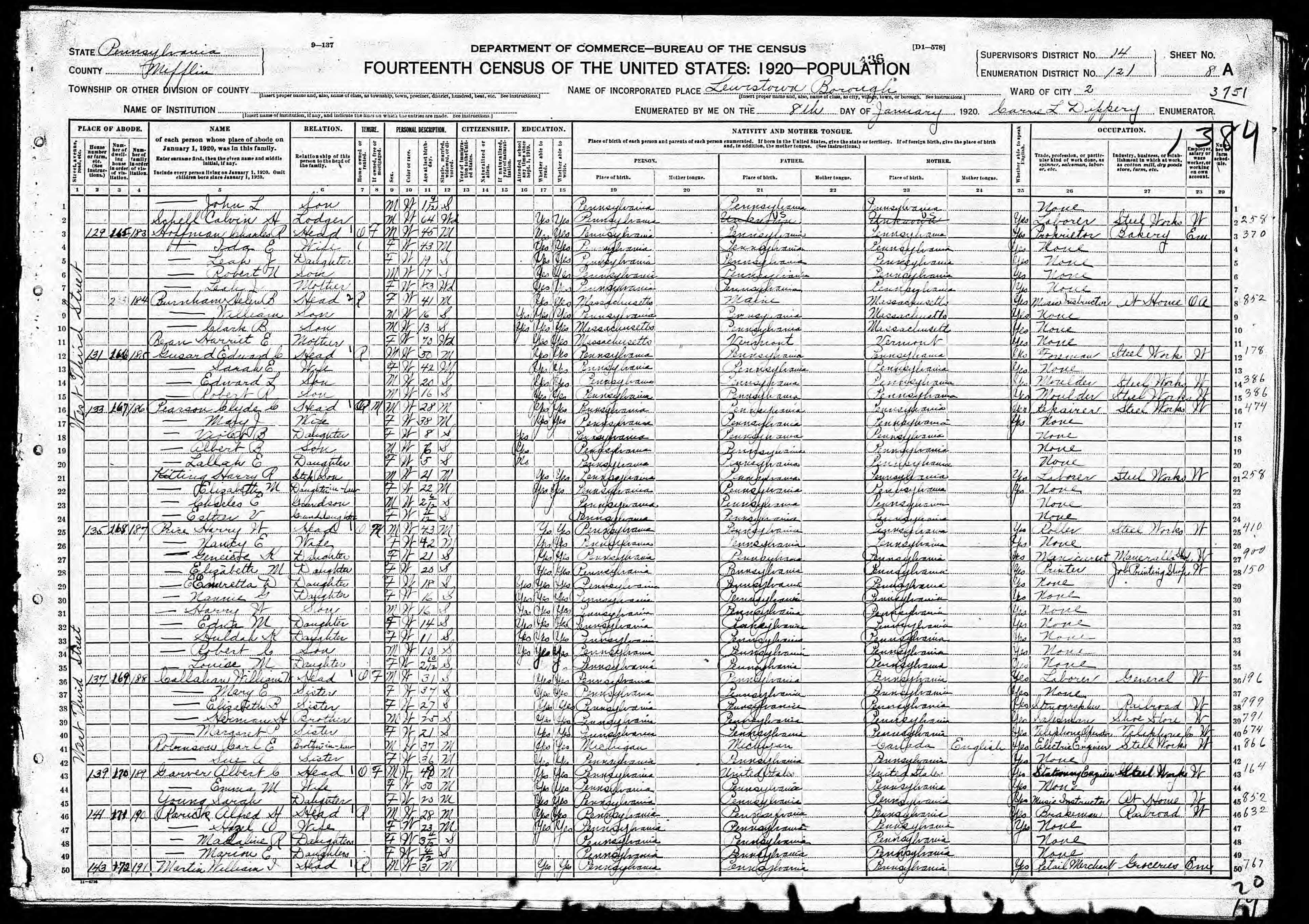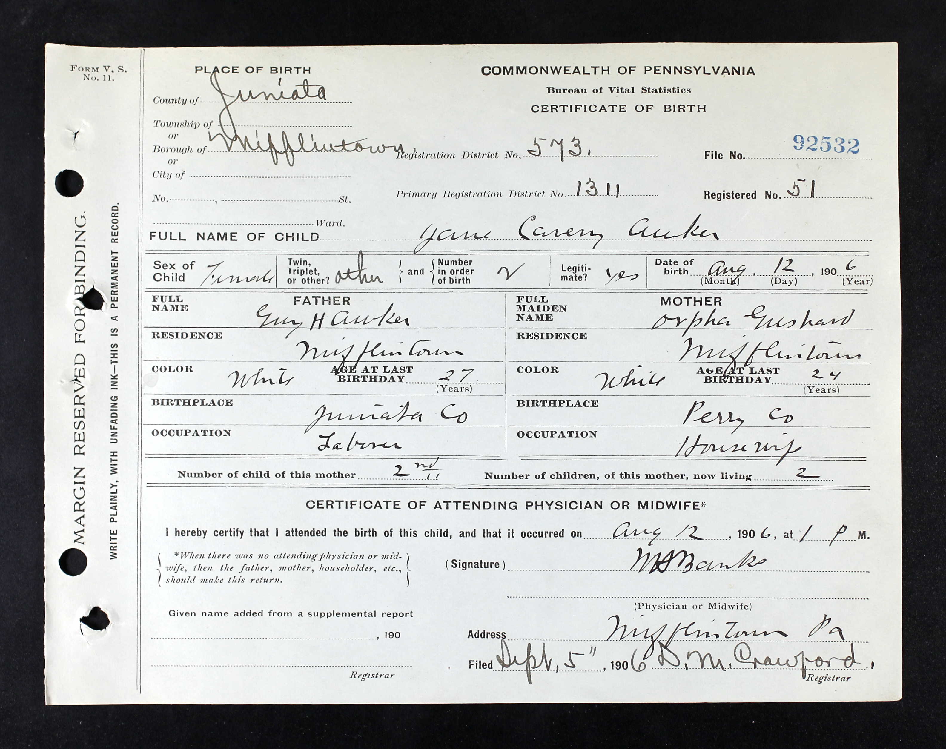 - b. Jul 26, 1886, Mifflintown, Juniata Co., PA;