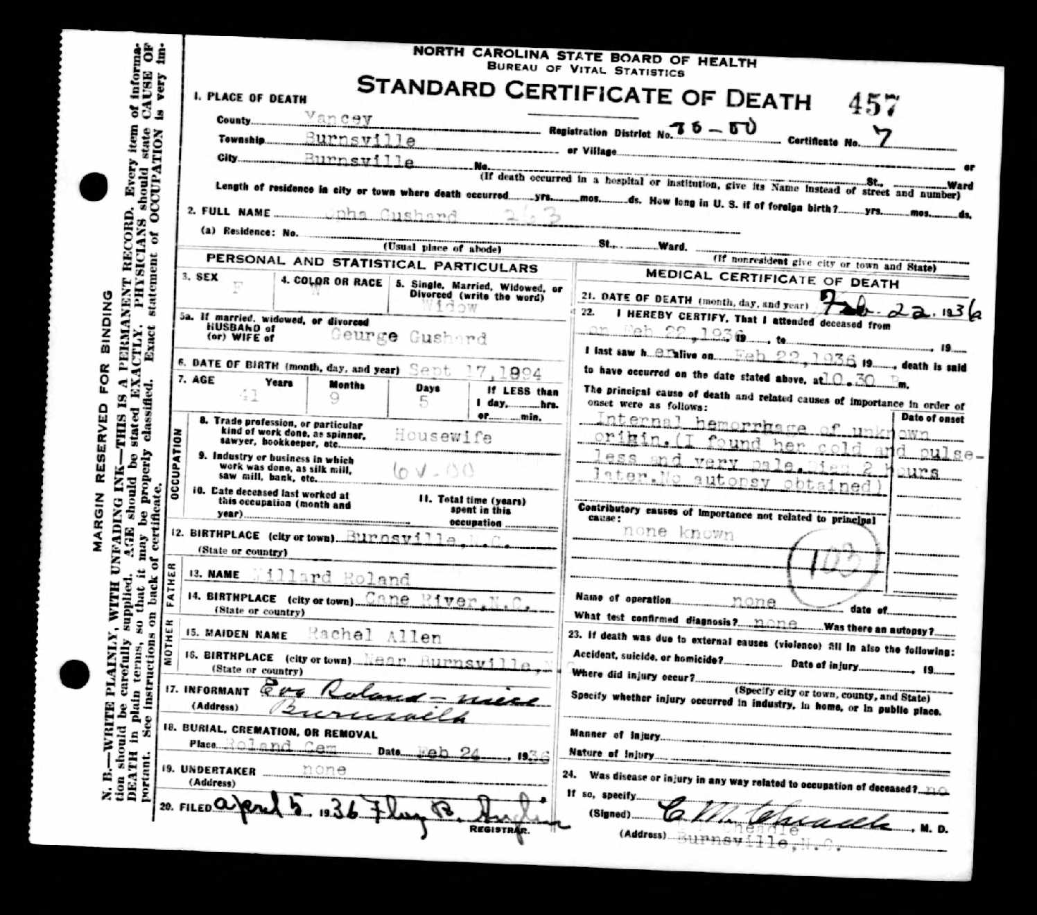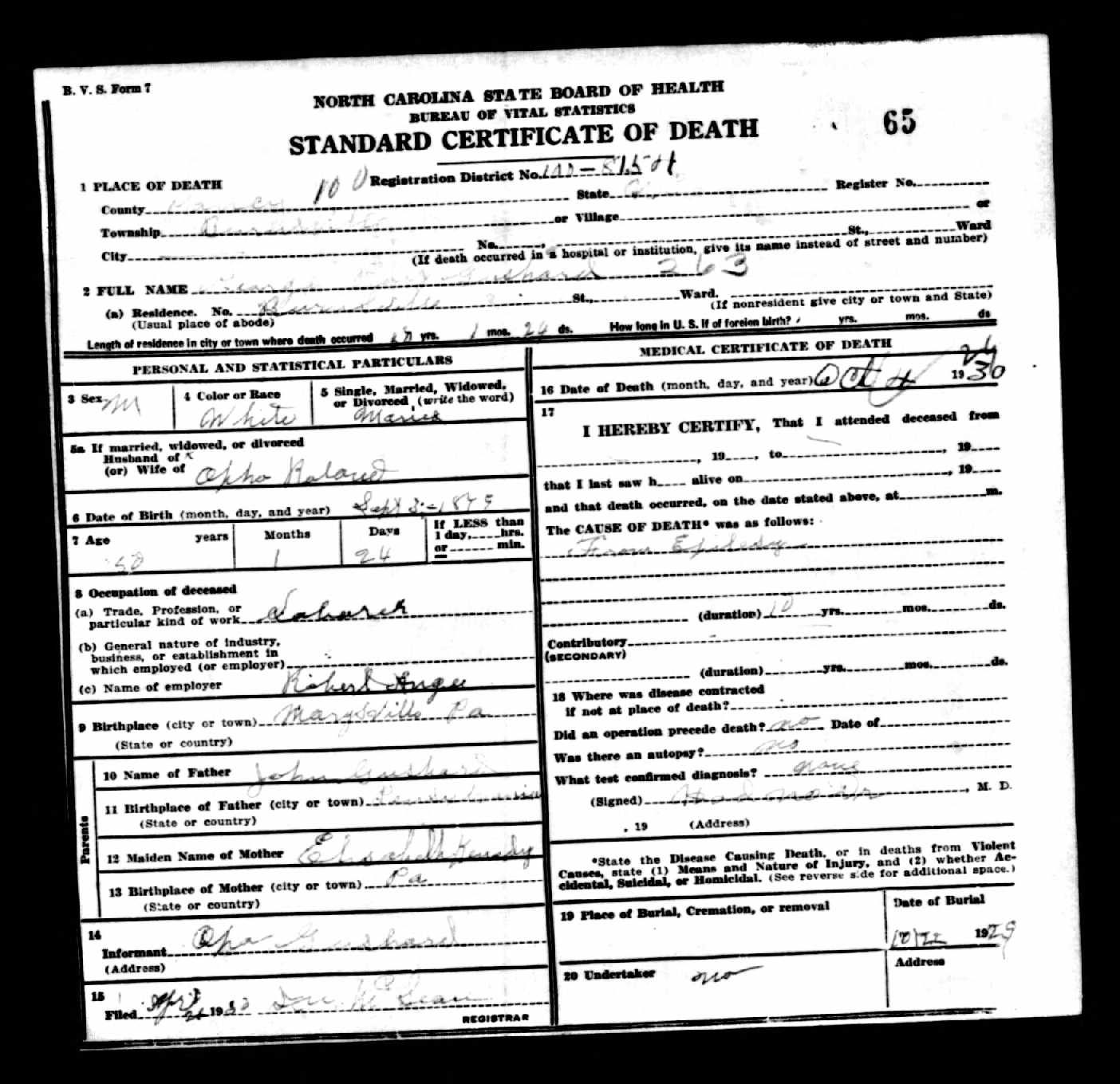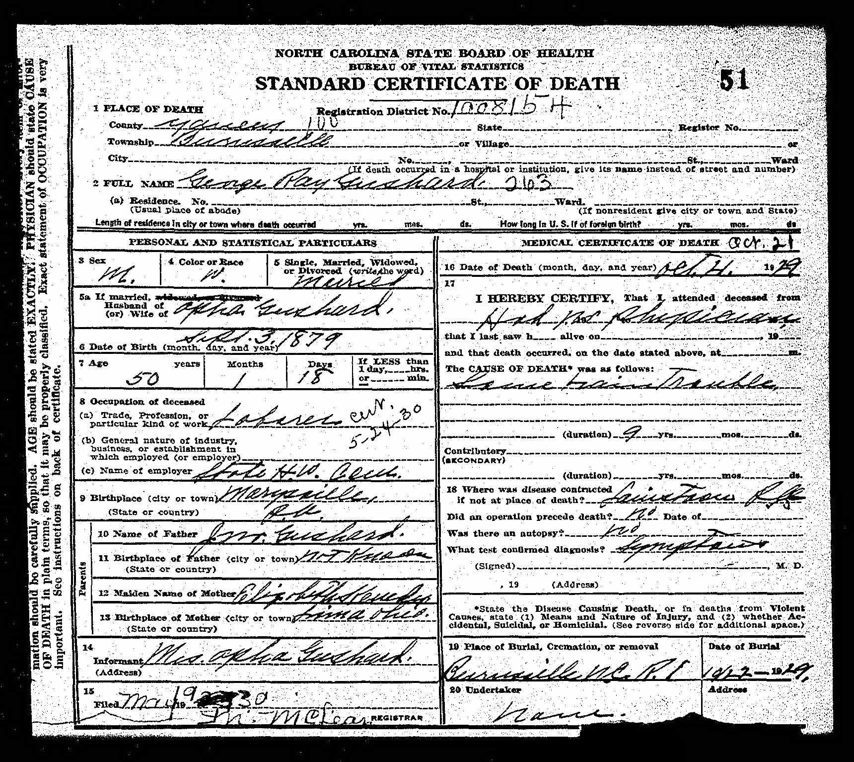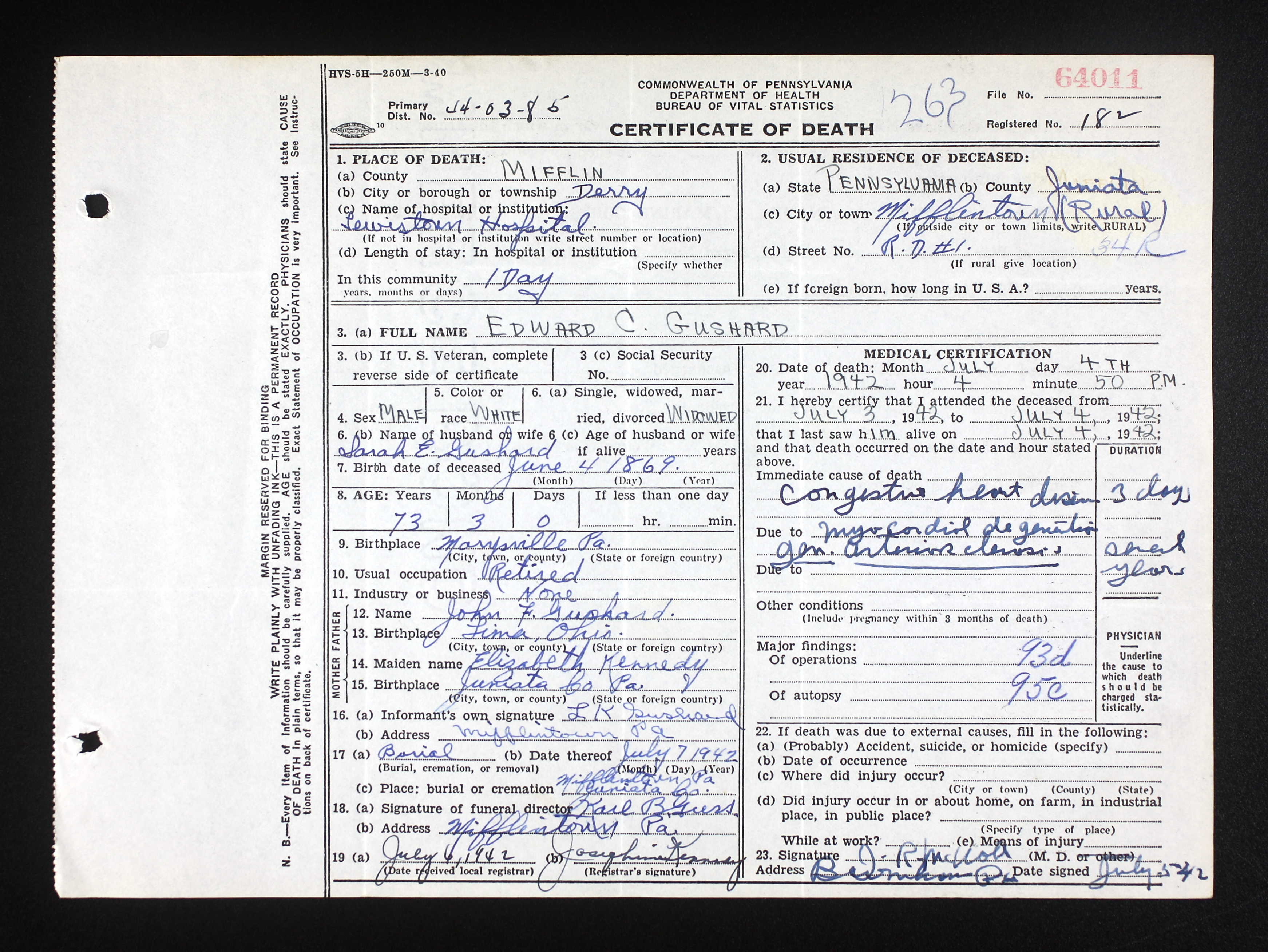 Death Certificate for Lemuel Kennedy Gushard
