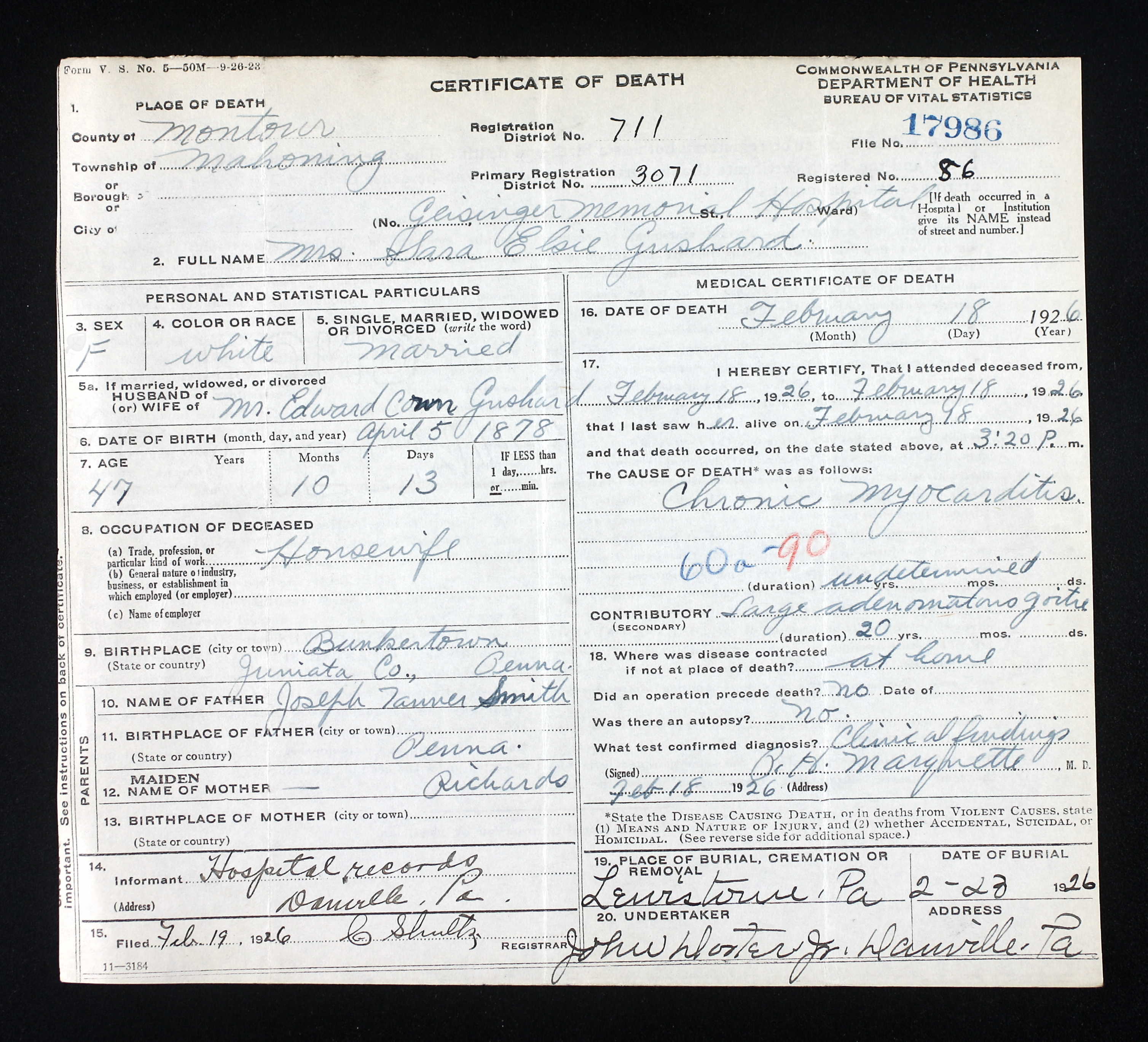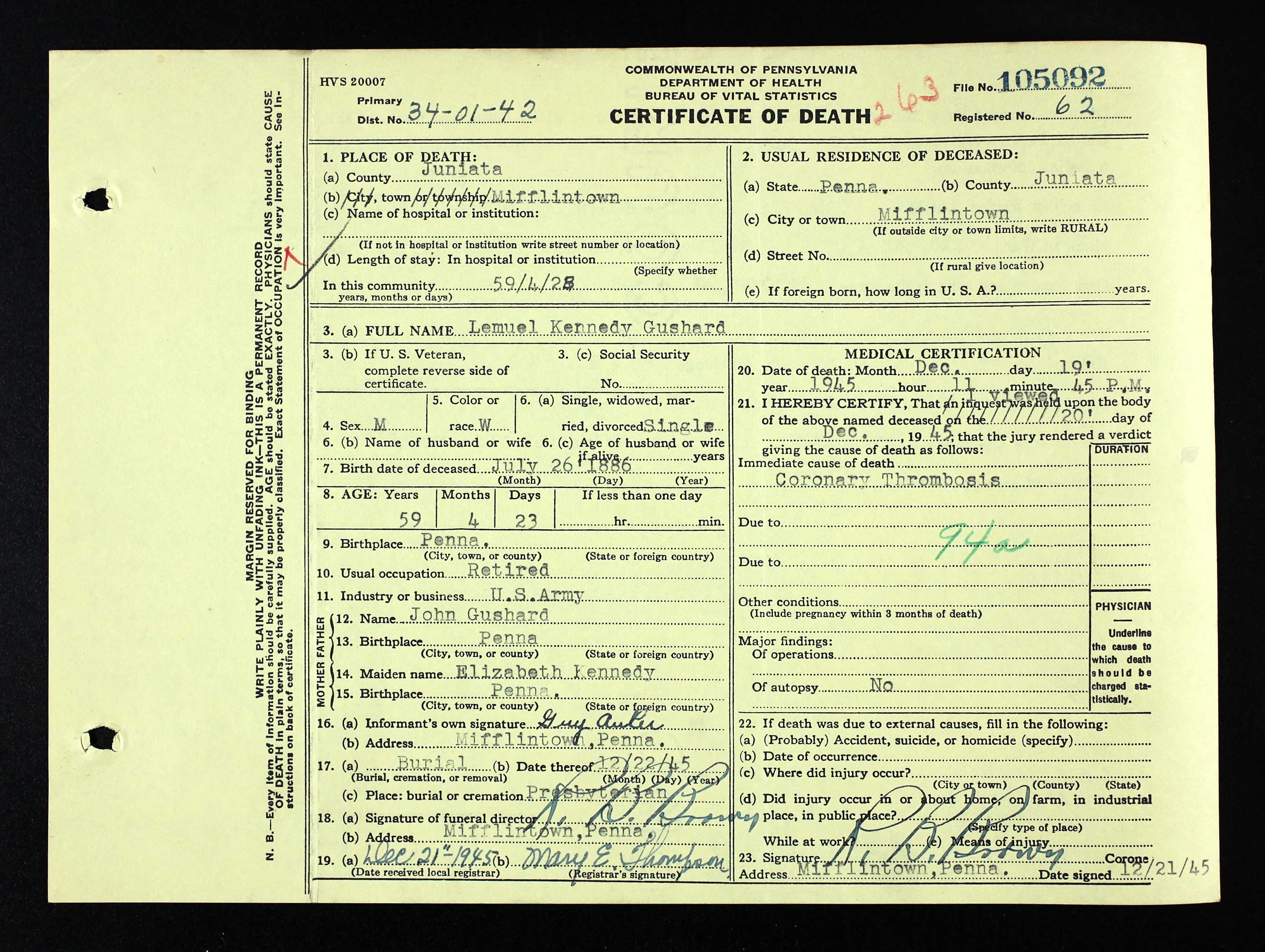 d. Dec 19, 1945, Mifflintown, Juniata Co., PA.