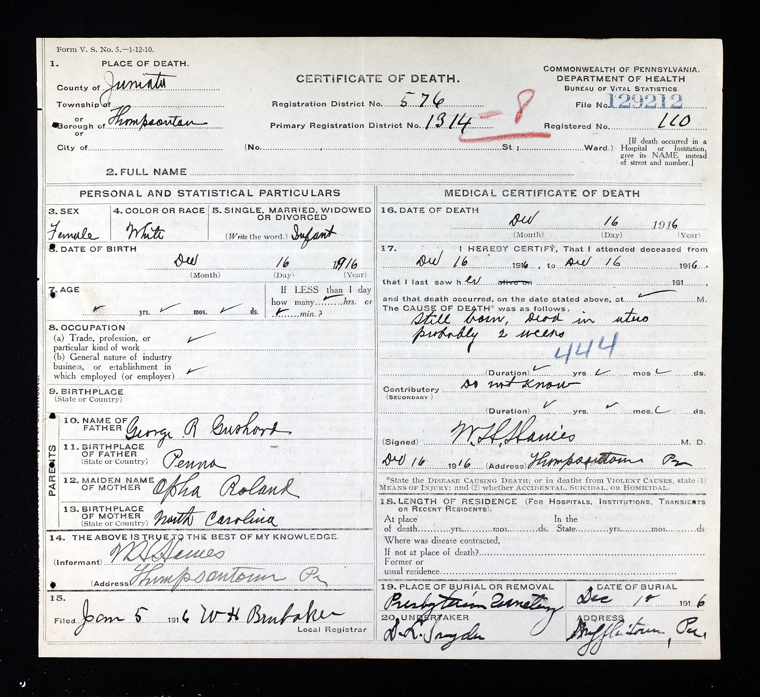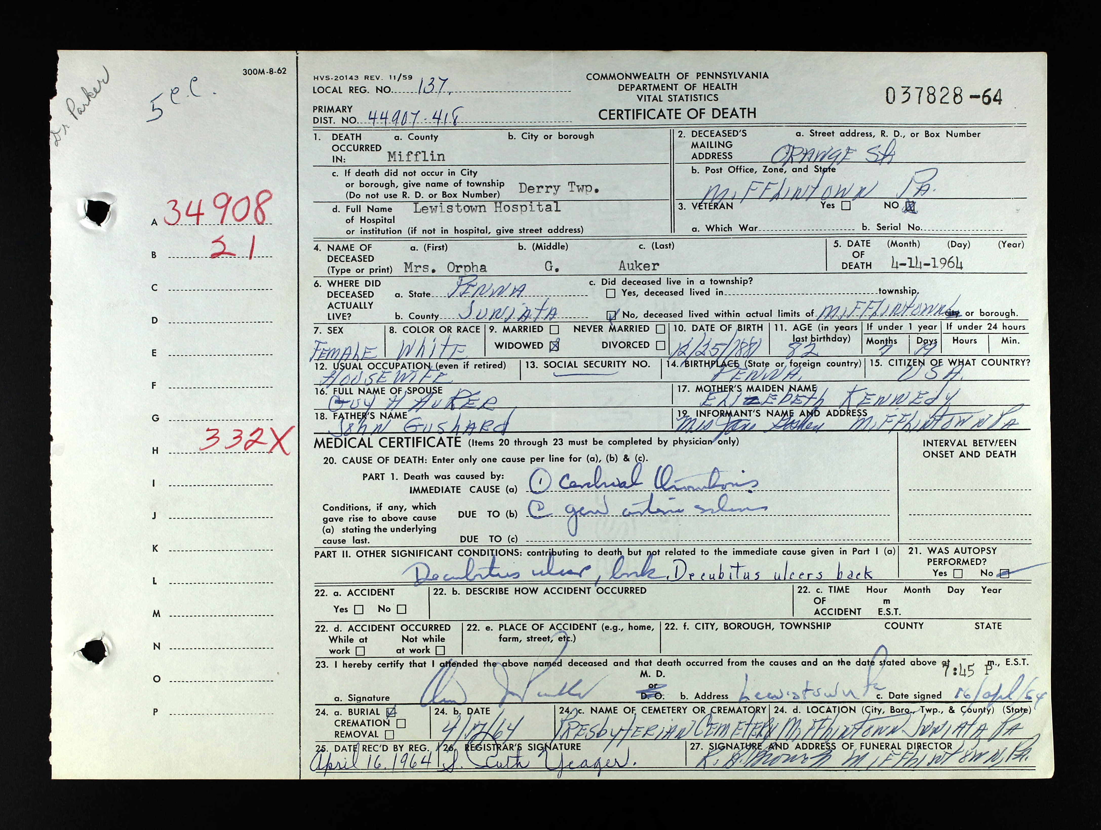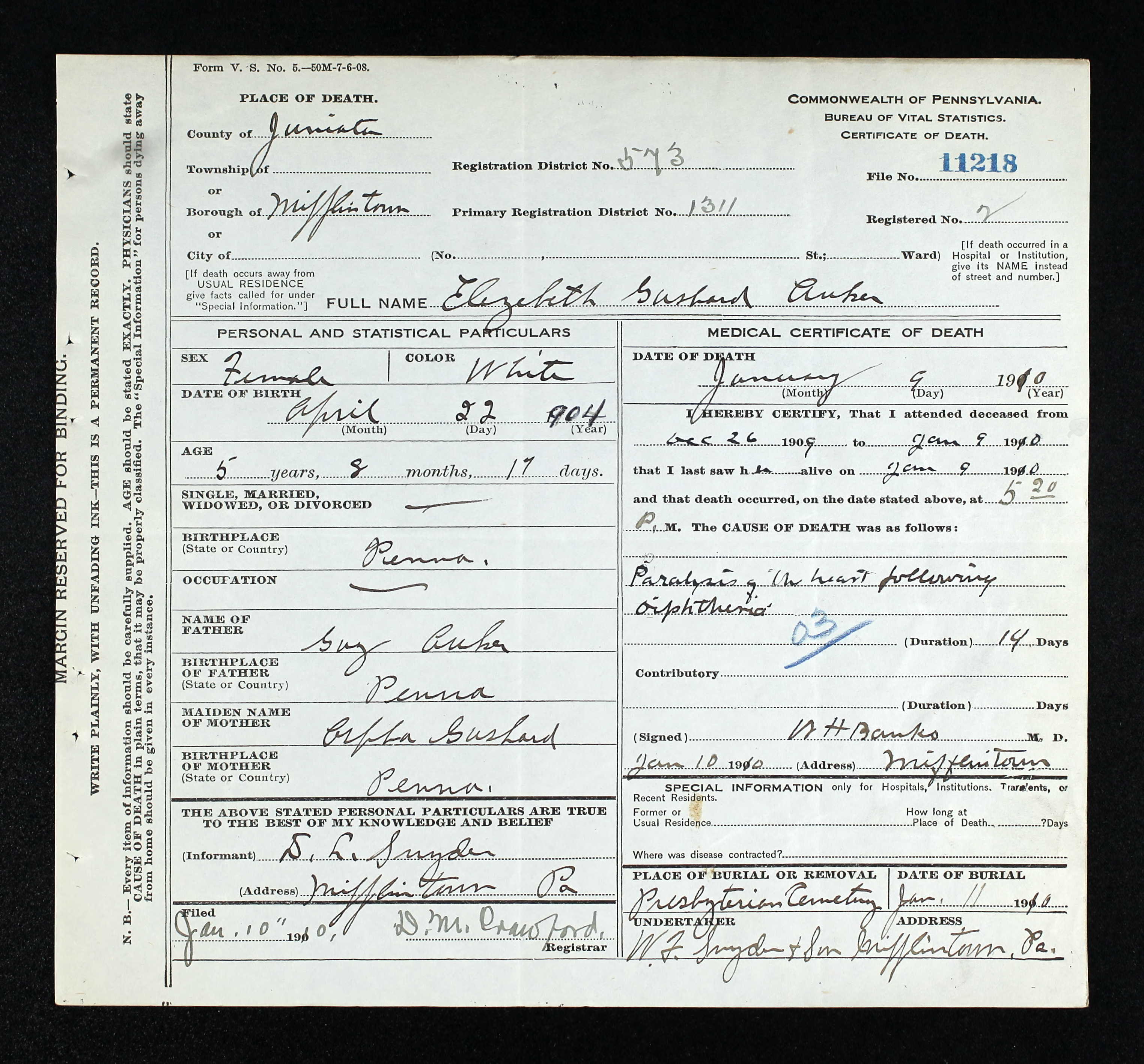 Dec 30, 1904, Mifflintown, Juniata Co., PA