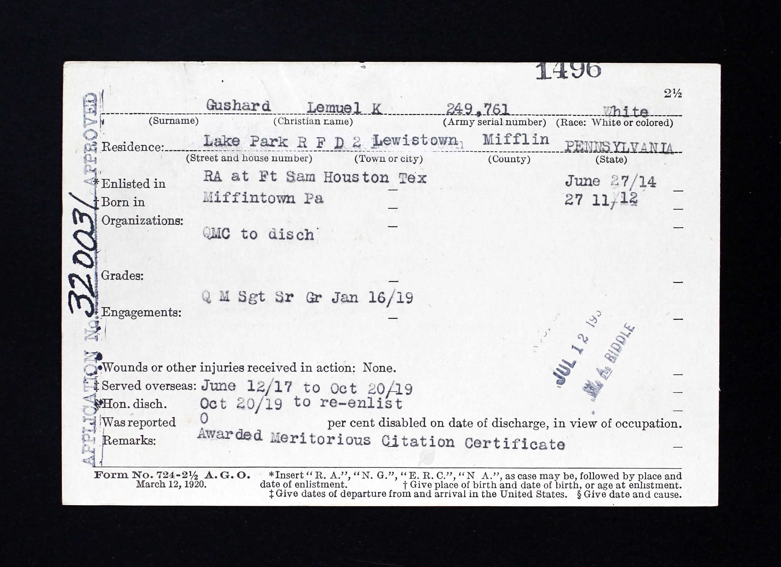 - Enlisted in Regular Army Jun 26, 1911, Lewistown, PA |