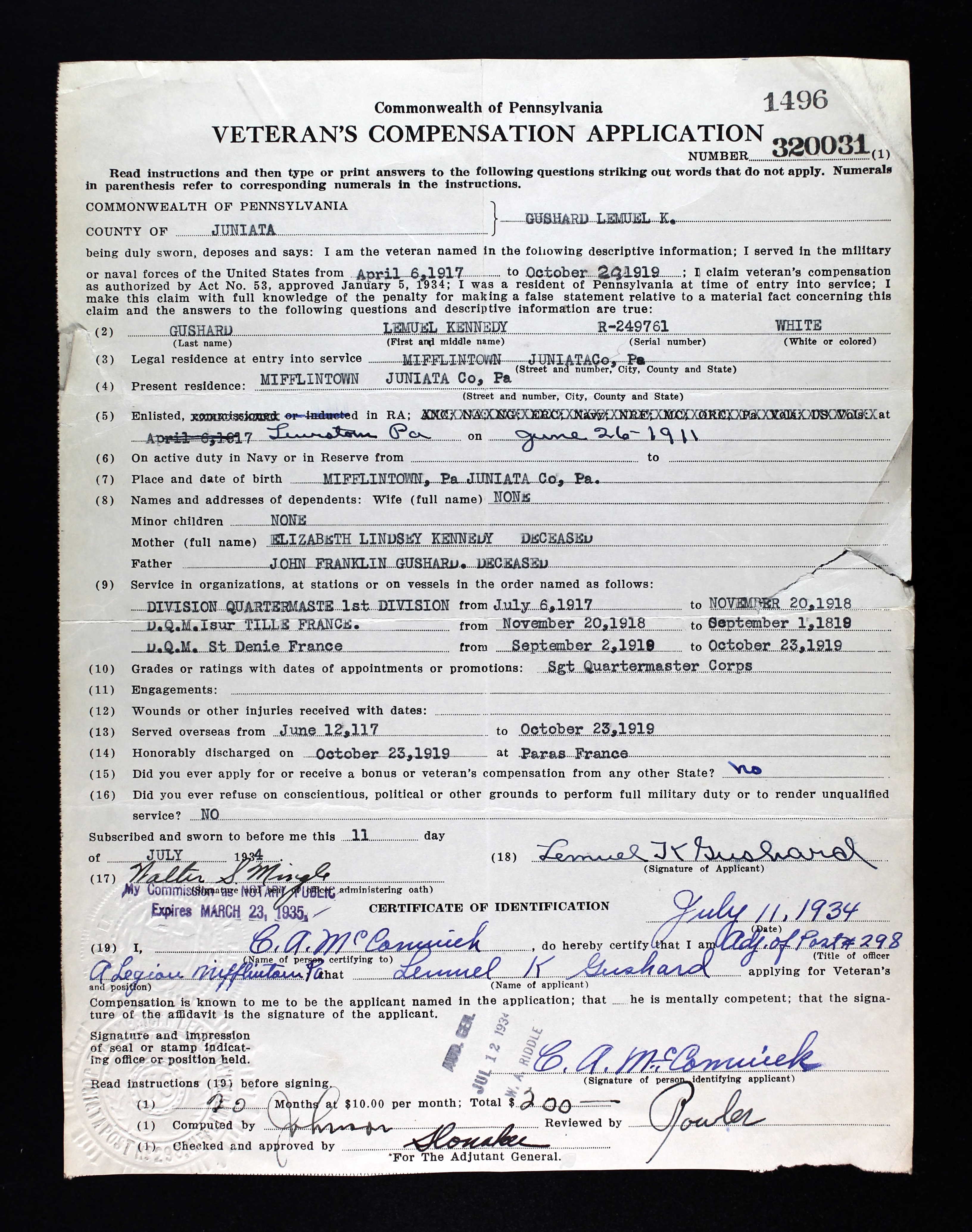 Pennsylvania, WWI Veterans Service and Compensation