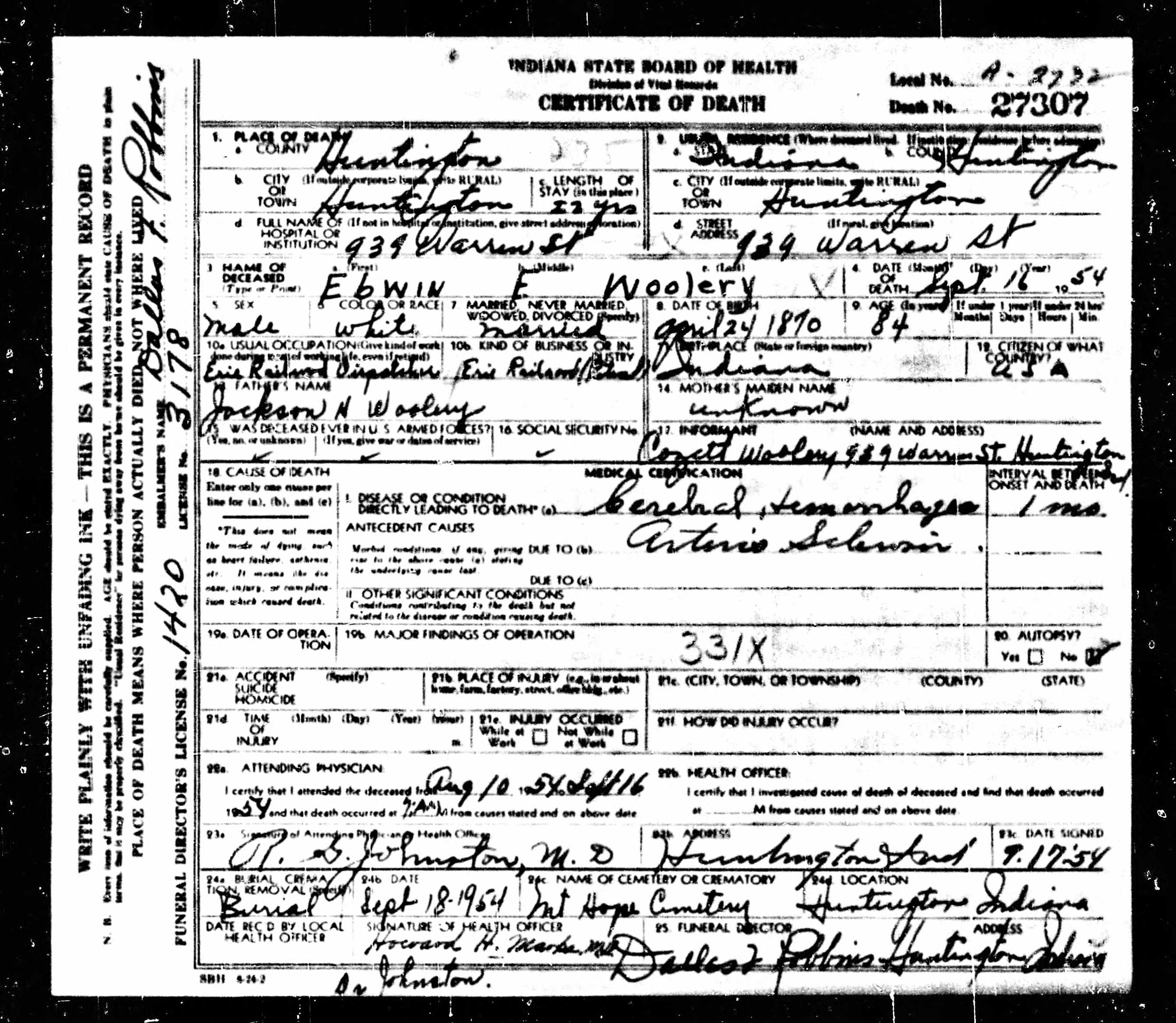 Death Certificate for Edwin E Woolery