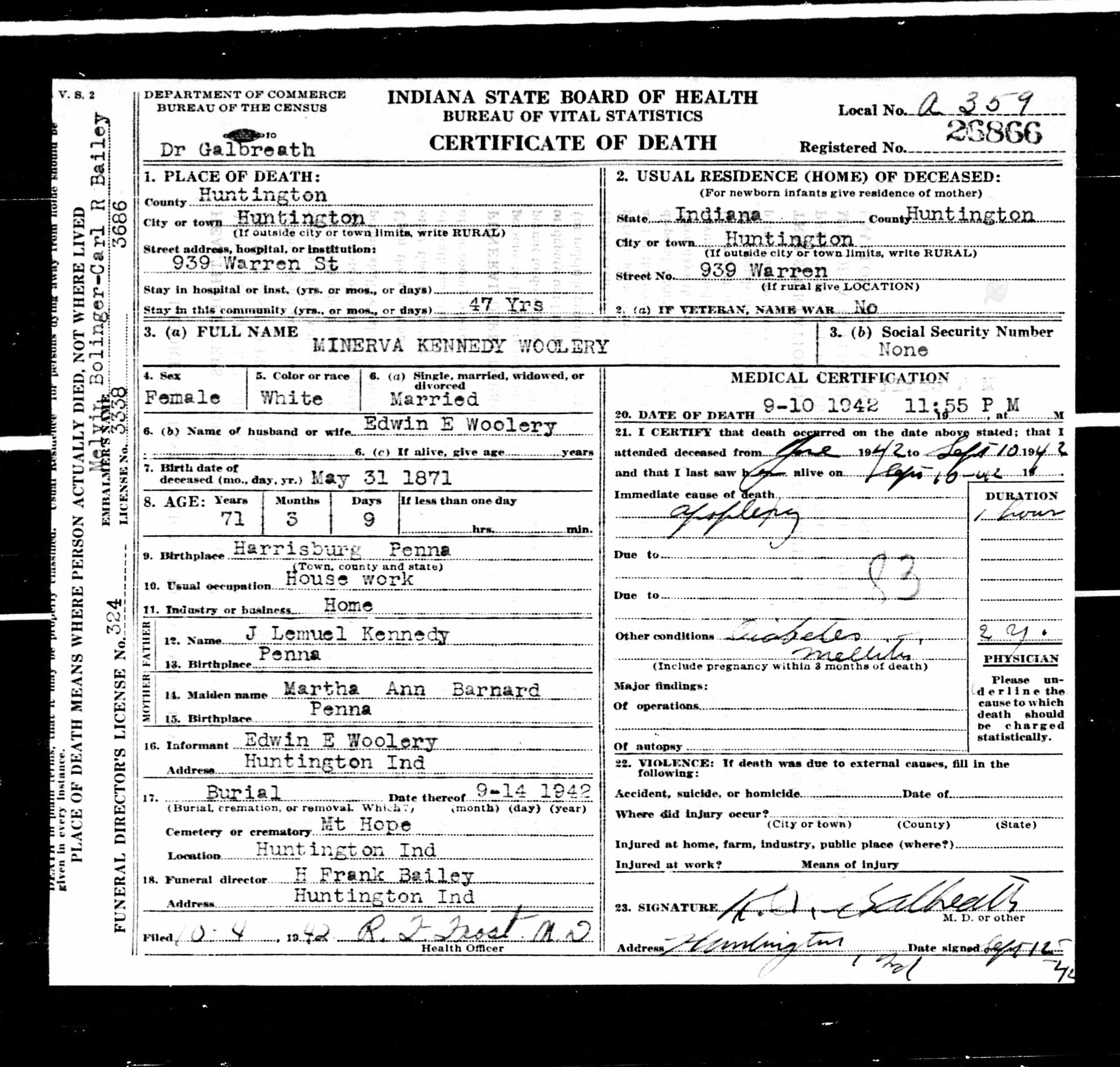 buried at Mount Hope Cemetery, Huntington, Huntington Co.,