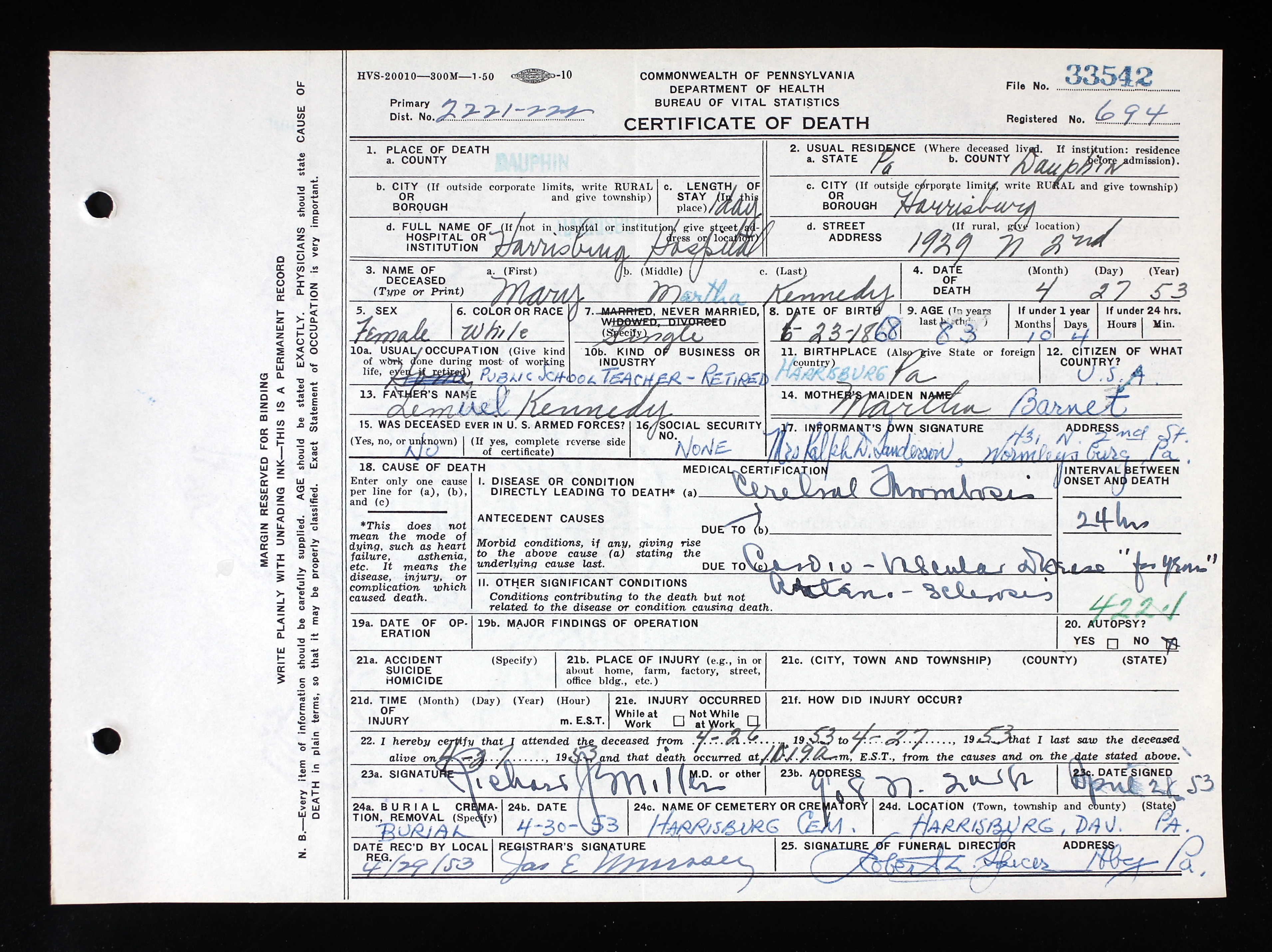 1953 - Mary Martha Kennedy passes