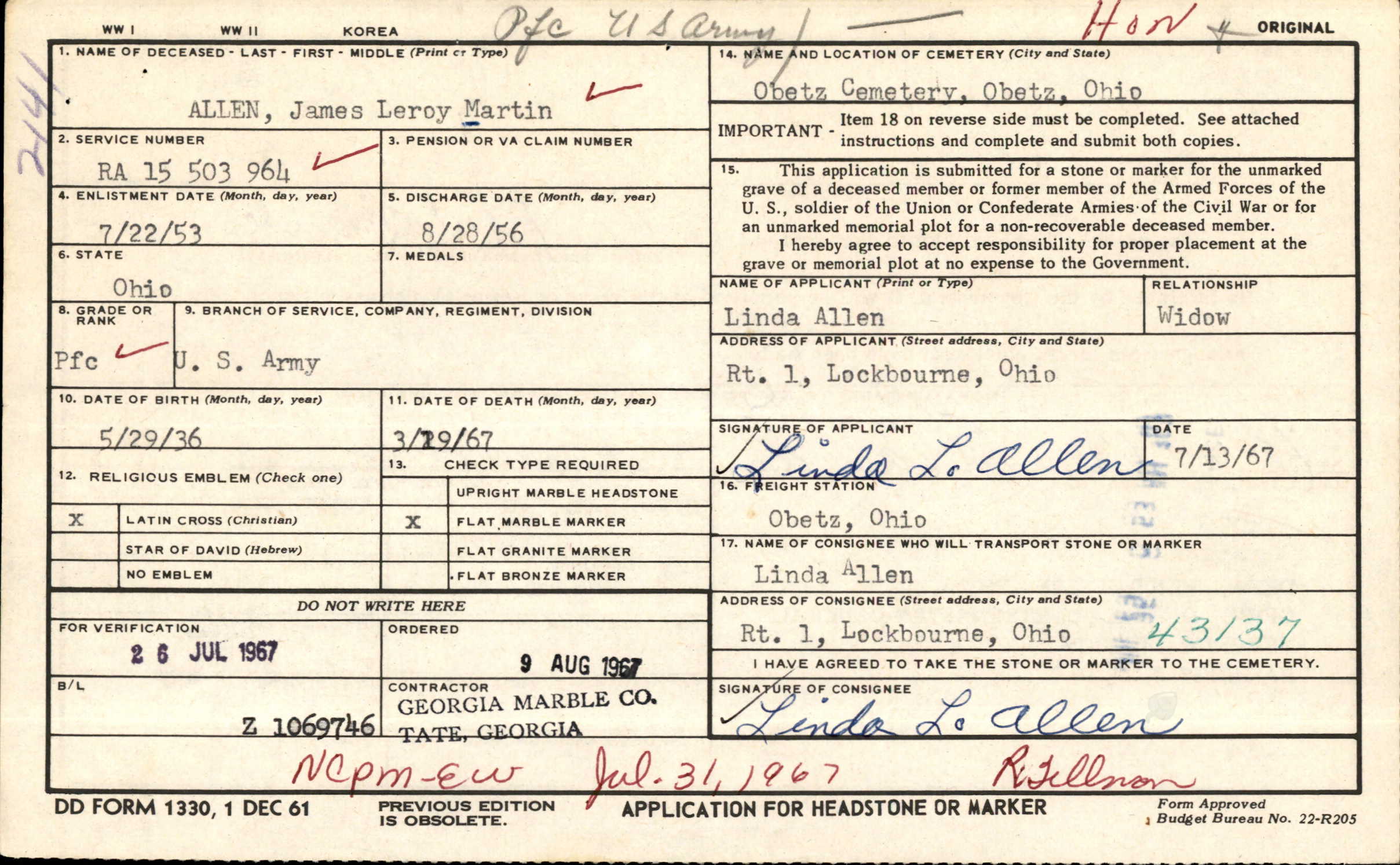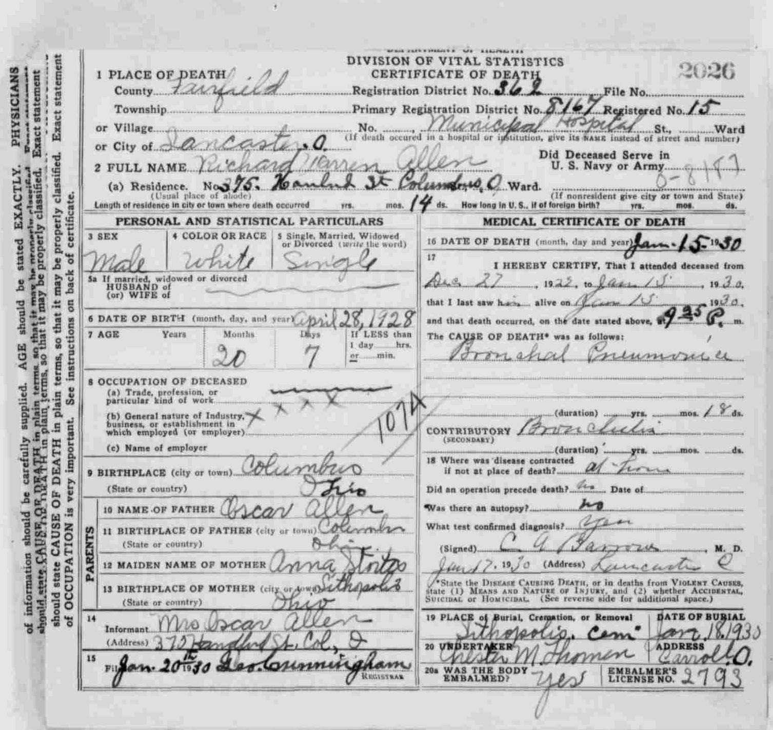 Stanley Delno Allen - b. Feb 17, 1911, Franklin Co., OH; d. Jan 4, 1969,