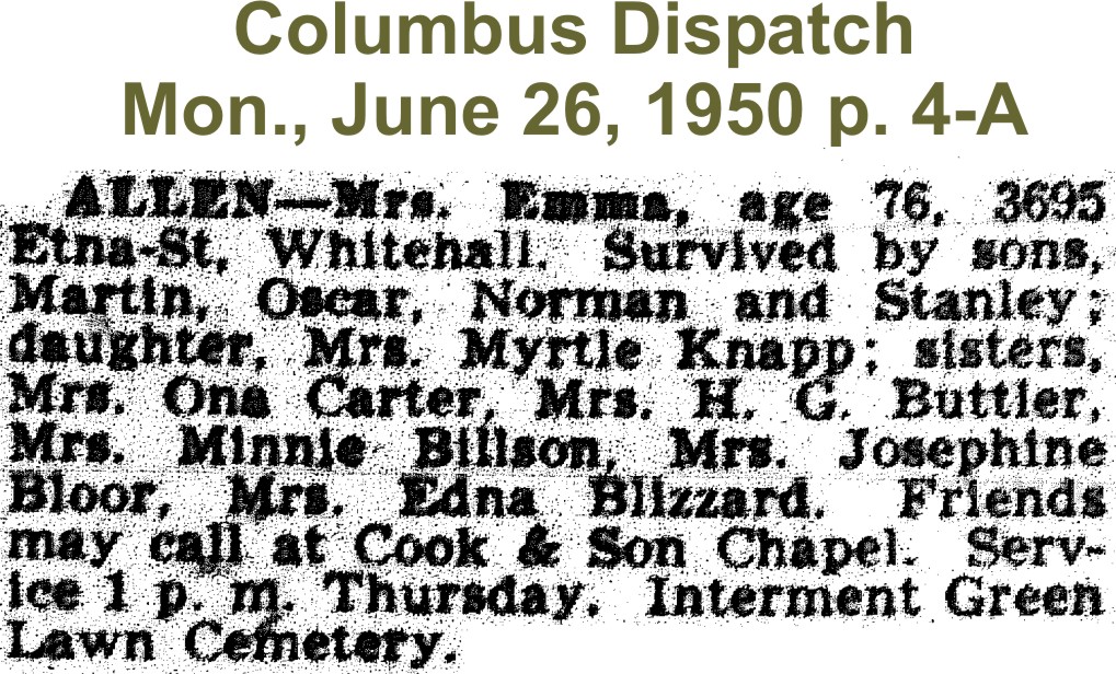 Columbus, Franklin Co., OH, buried at Green Lawn Cemetery, Columbus,