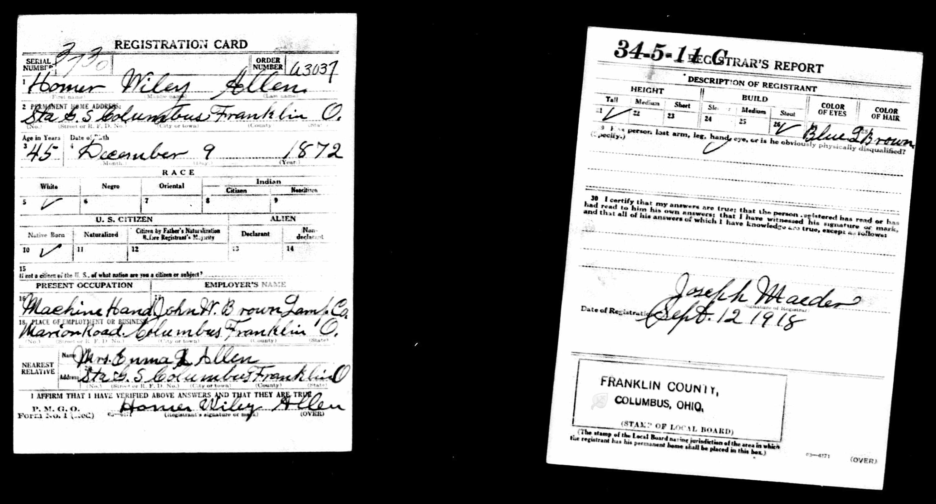- (b. Dec 9, 1872, Brown, Vinton Co., OH, son of Isaac Allen