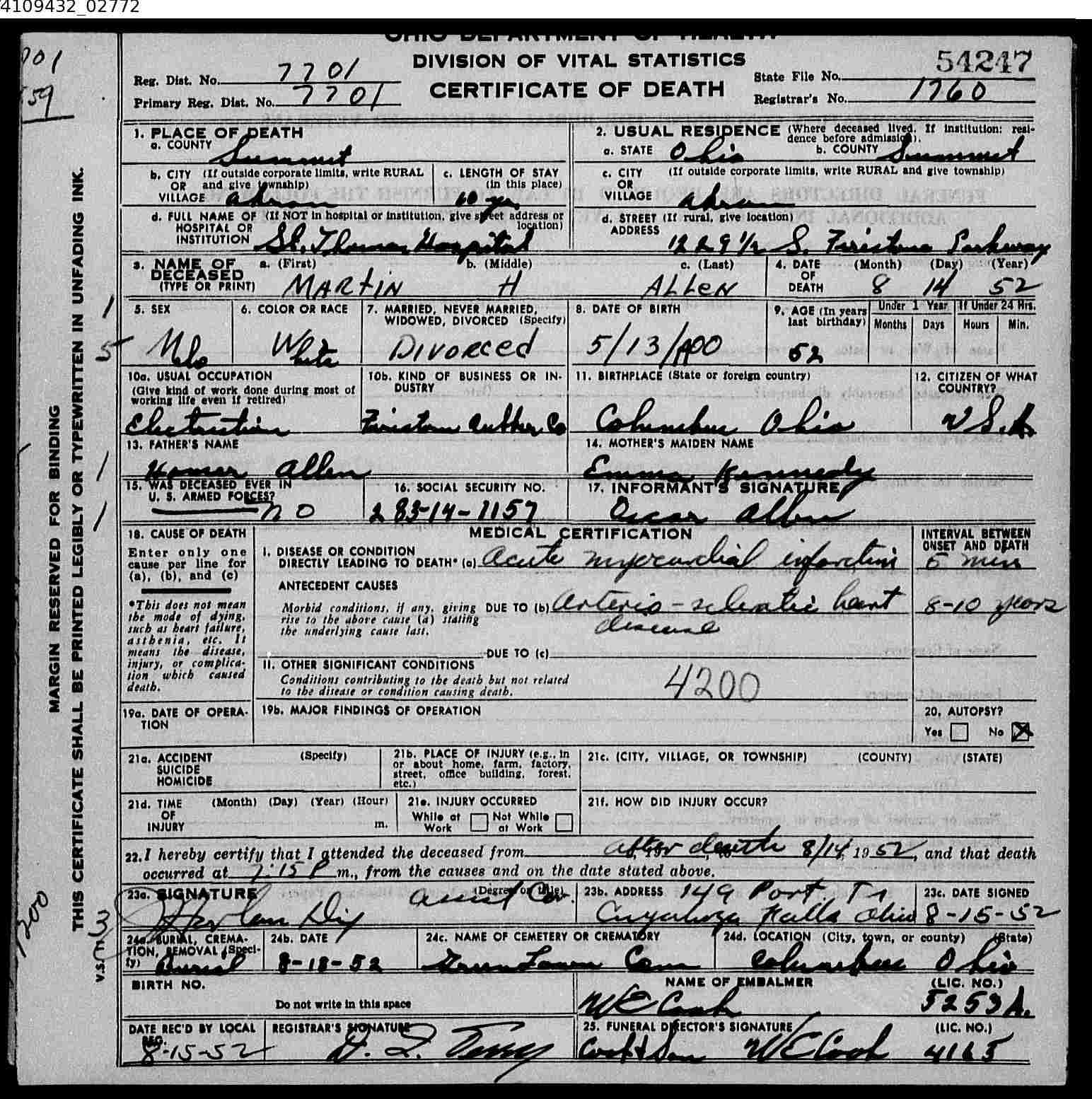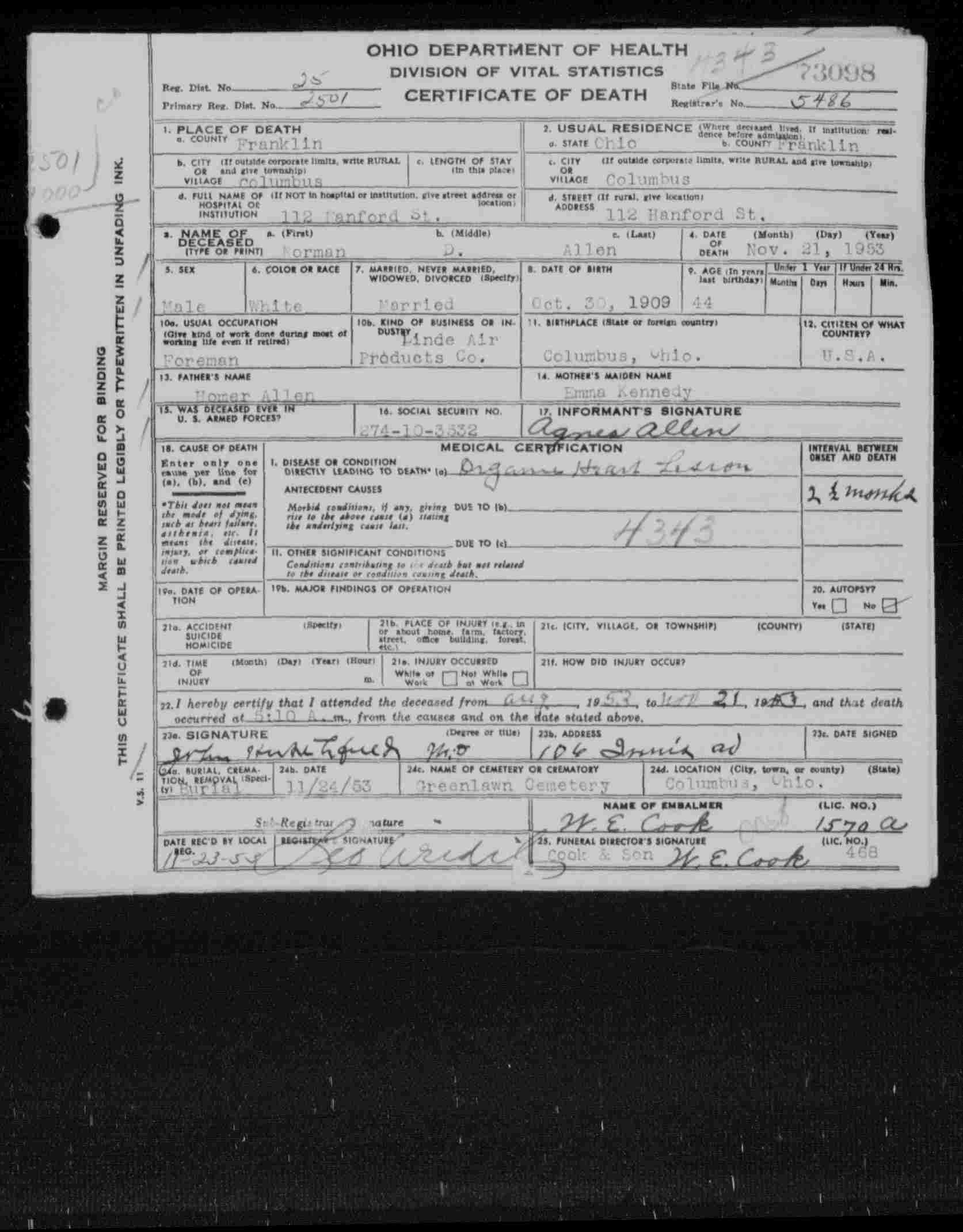 Death certificate for Norman D Allen