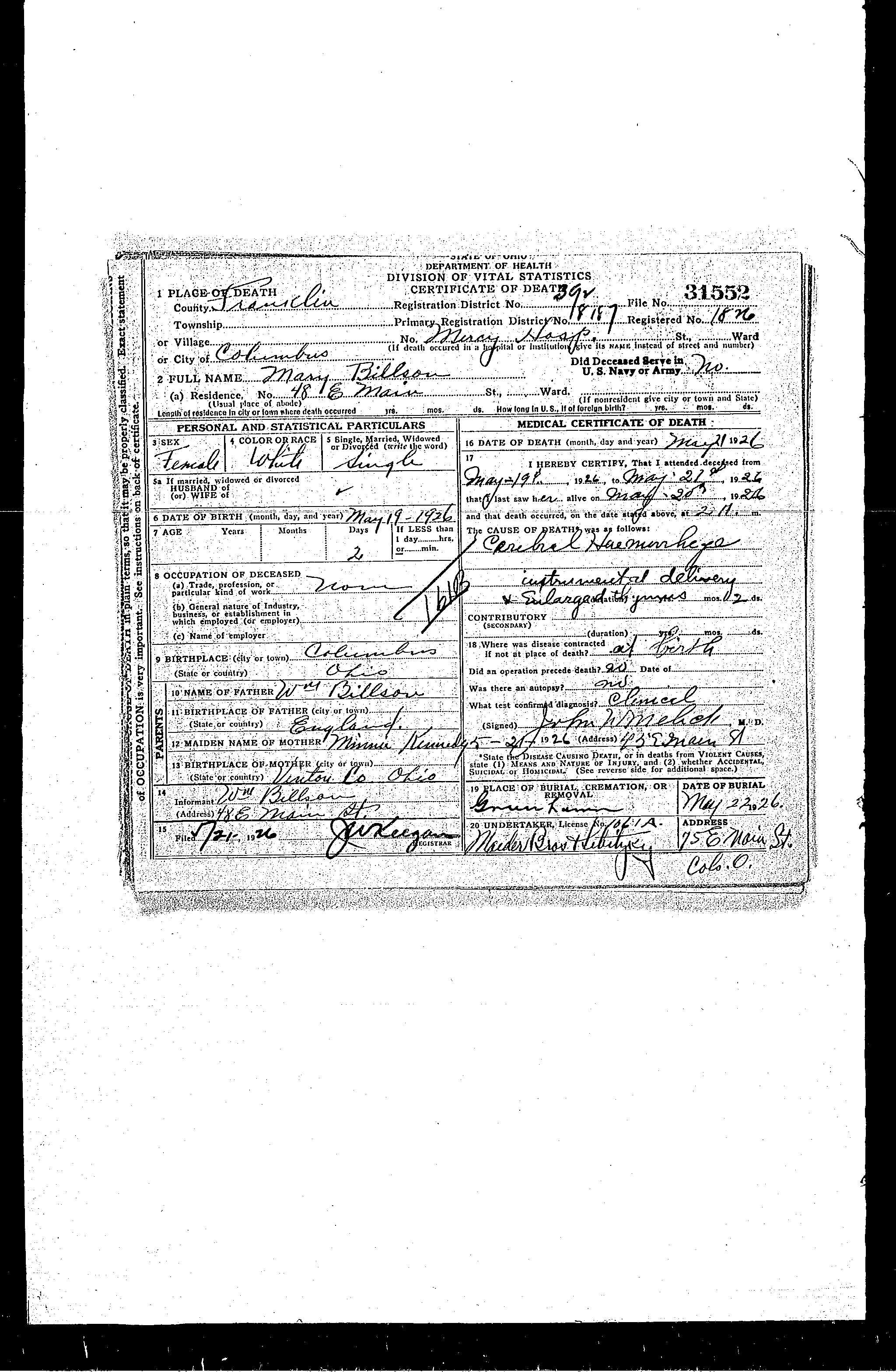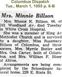 Mary Billson - b. May 19, 1926, Columbus, Franklin Co., OH; d.