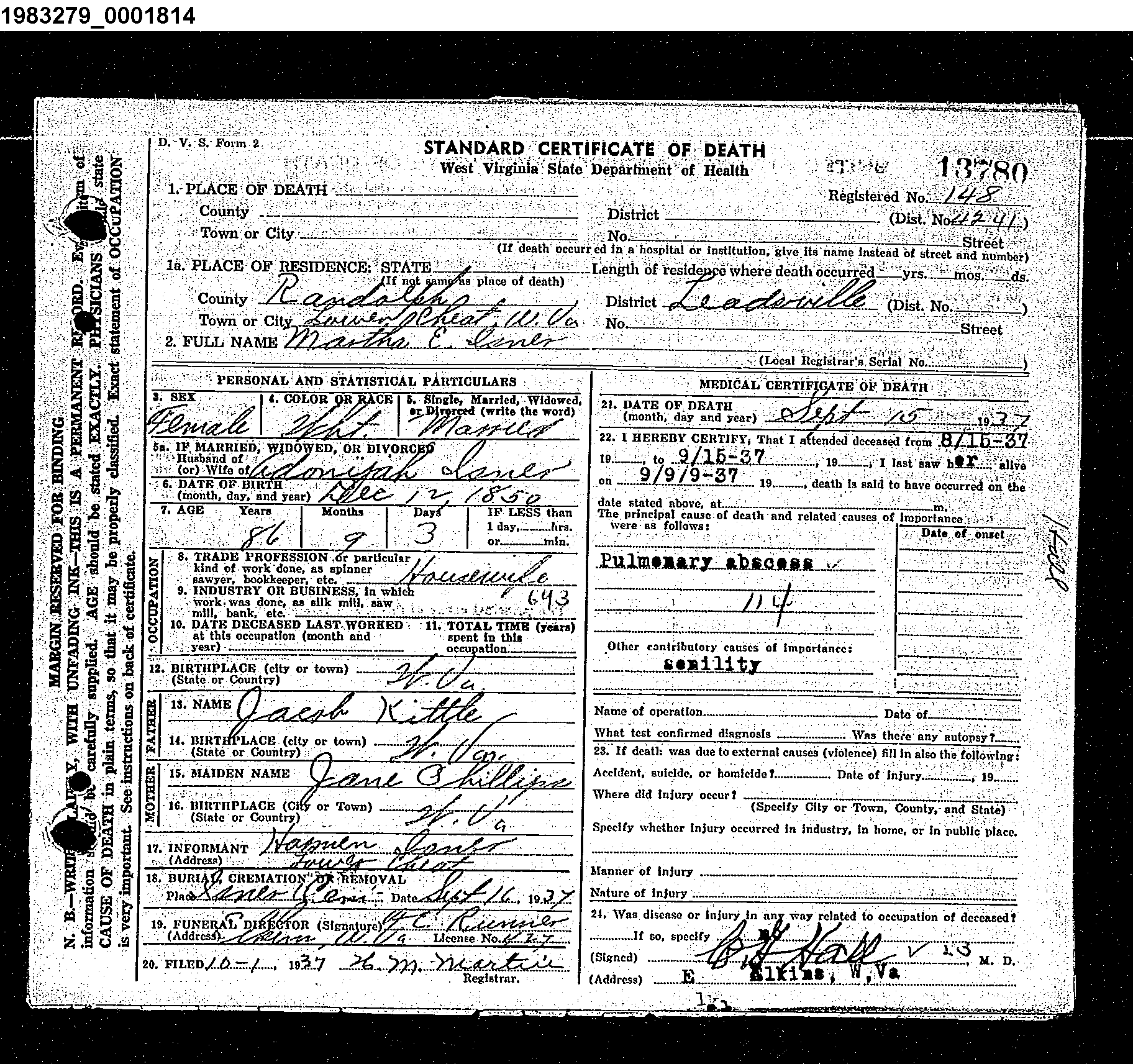 - b. Jun 20, 1890, d. Dec 1982, Elkins, Randolph Co., WV