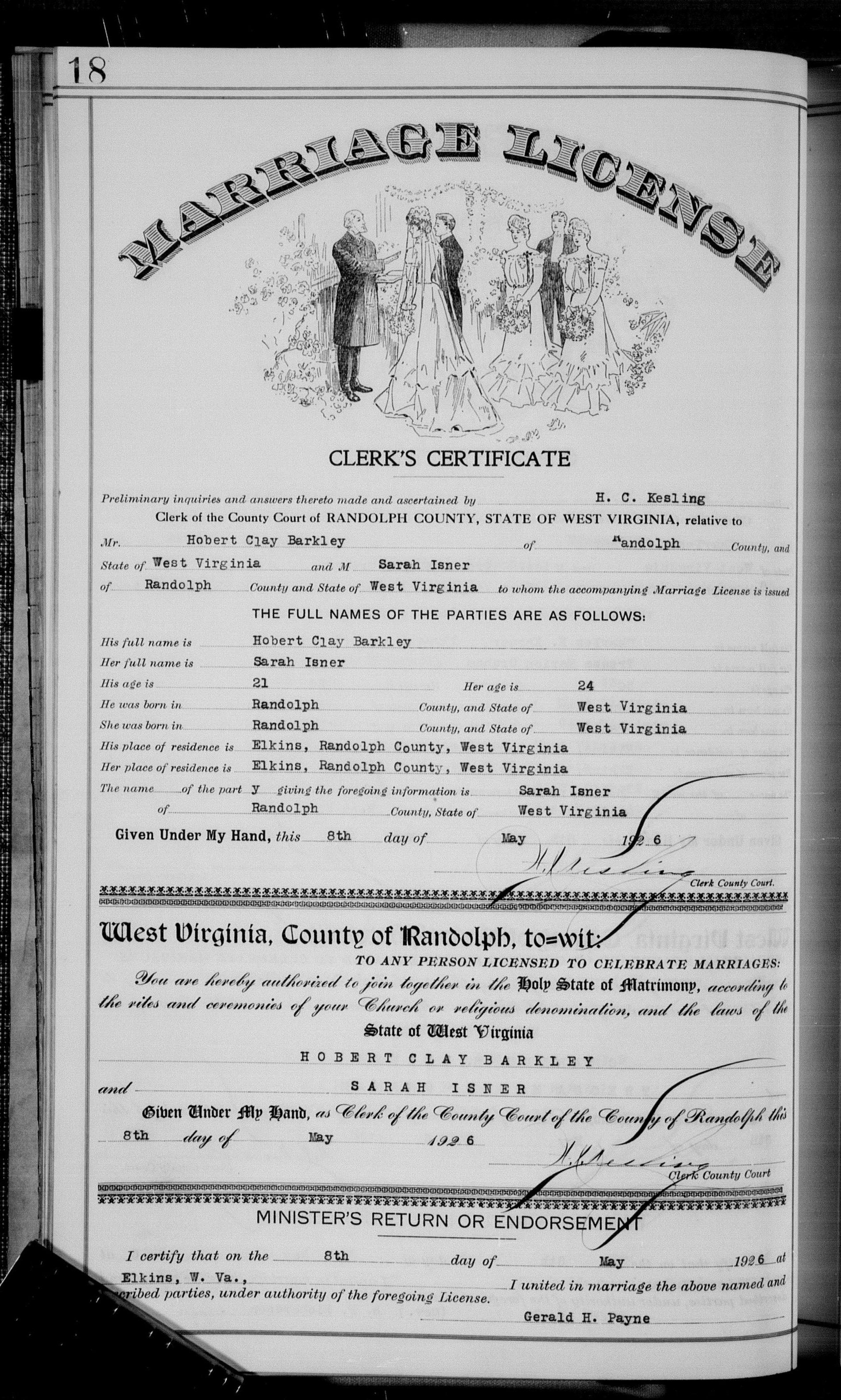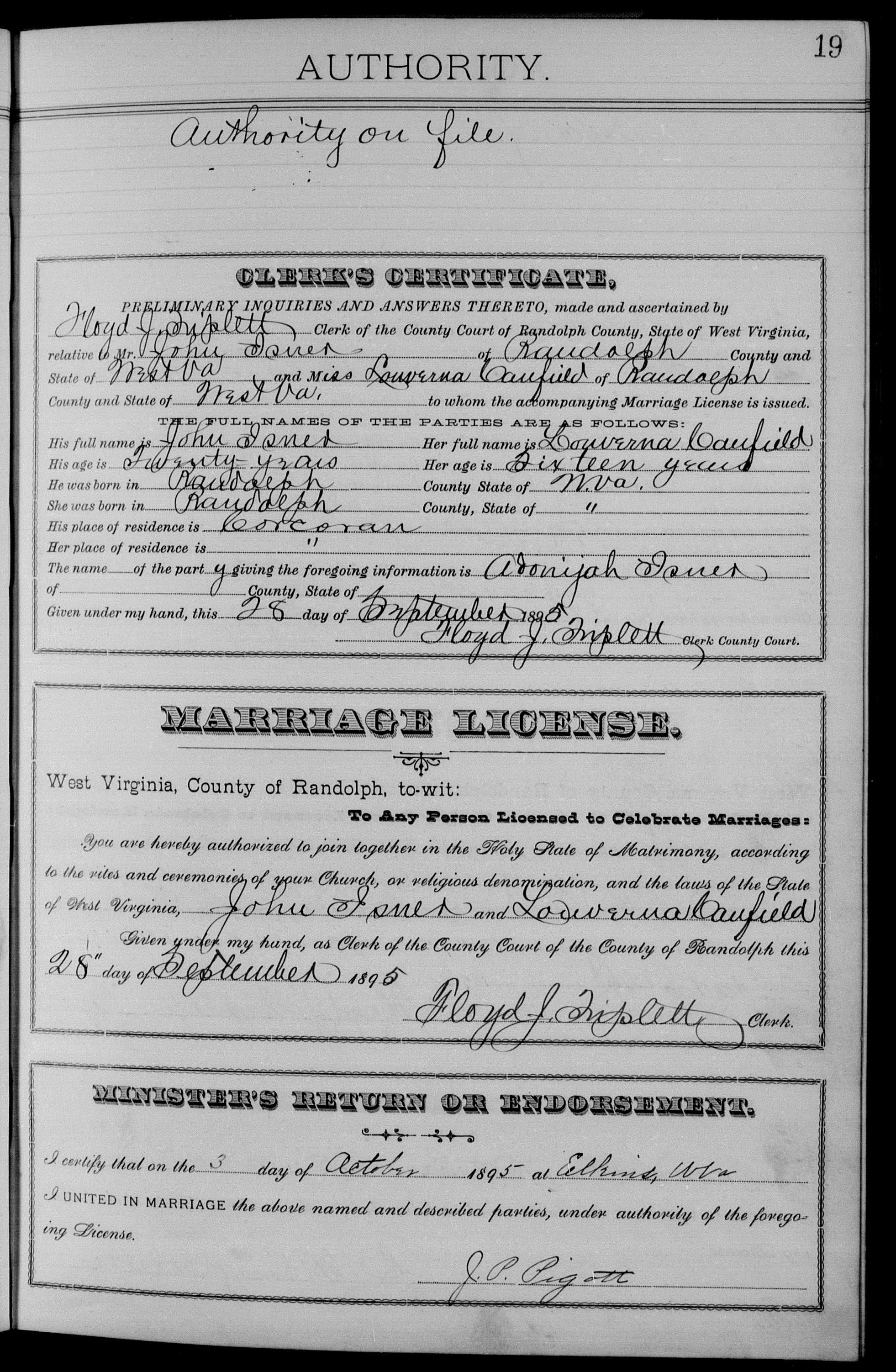Marries Luvernia Ann Canfield, Oct 3, 1895, Elkins, Randolph