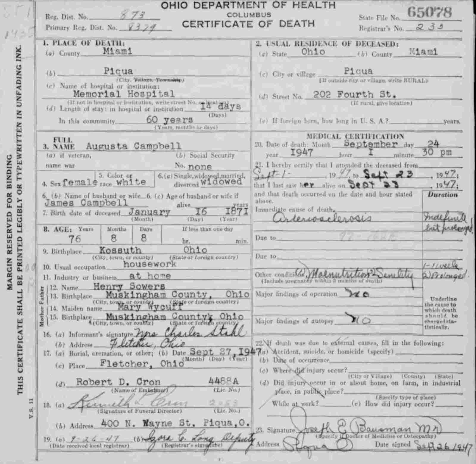 PIQUA - Mrs. Augusta Campbell, 76, 202 Fourth street, died