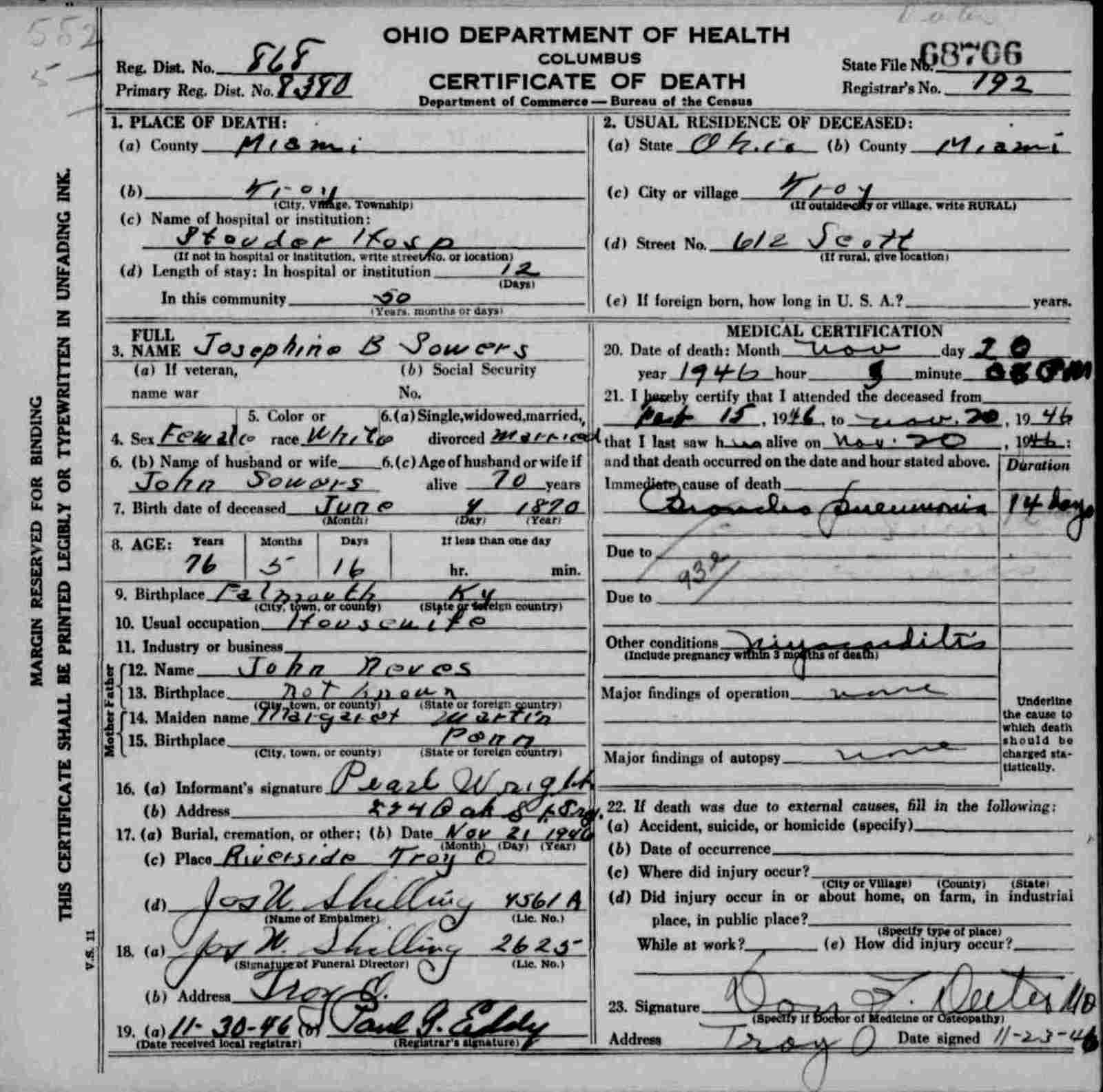 Margaret Martin ; d. Nov 20, 1946, Troy, Miami Co., OH. Was