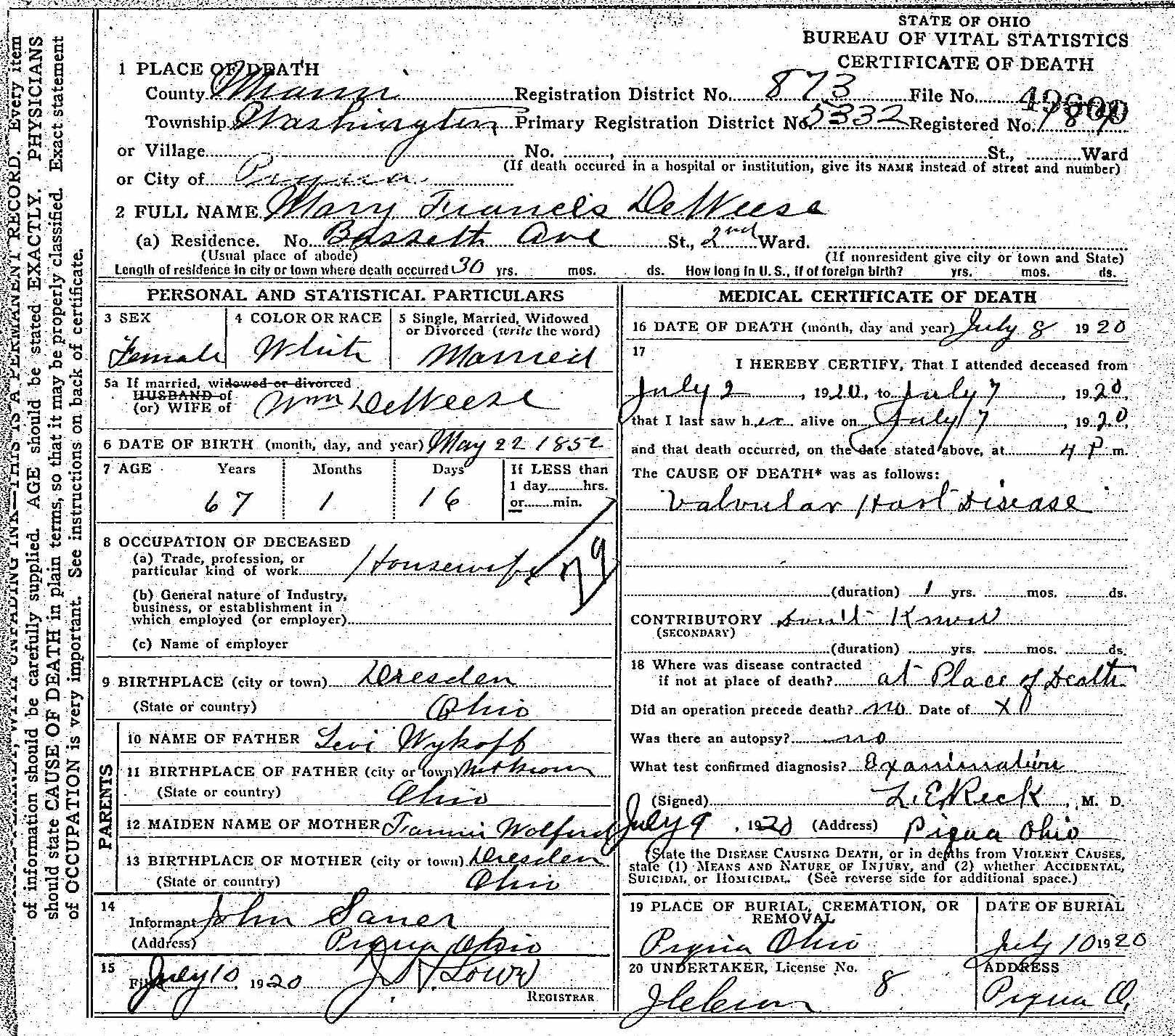 Miami Co., OH under name Mary Frances DeWeese ) - May 10, 1863 Auglaize