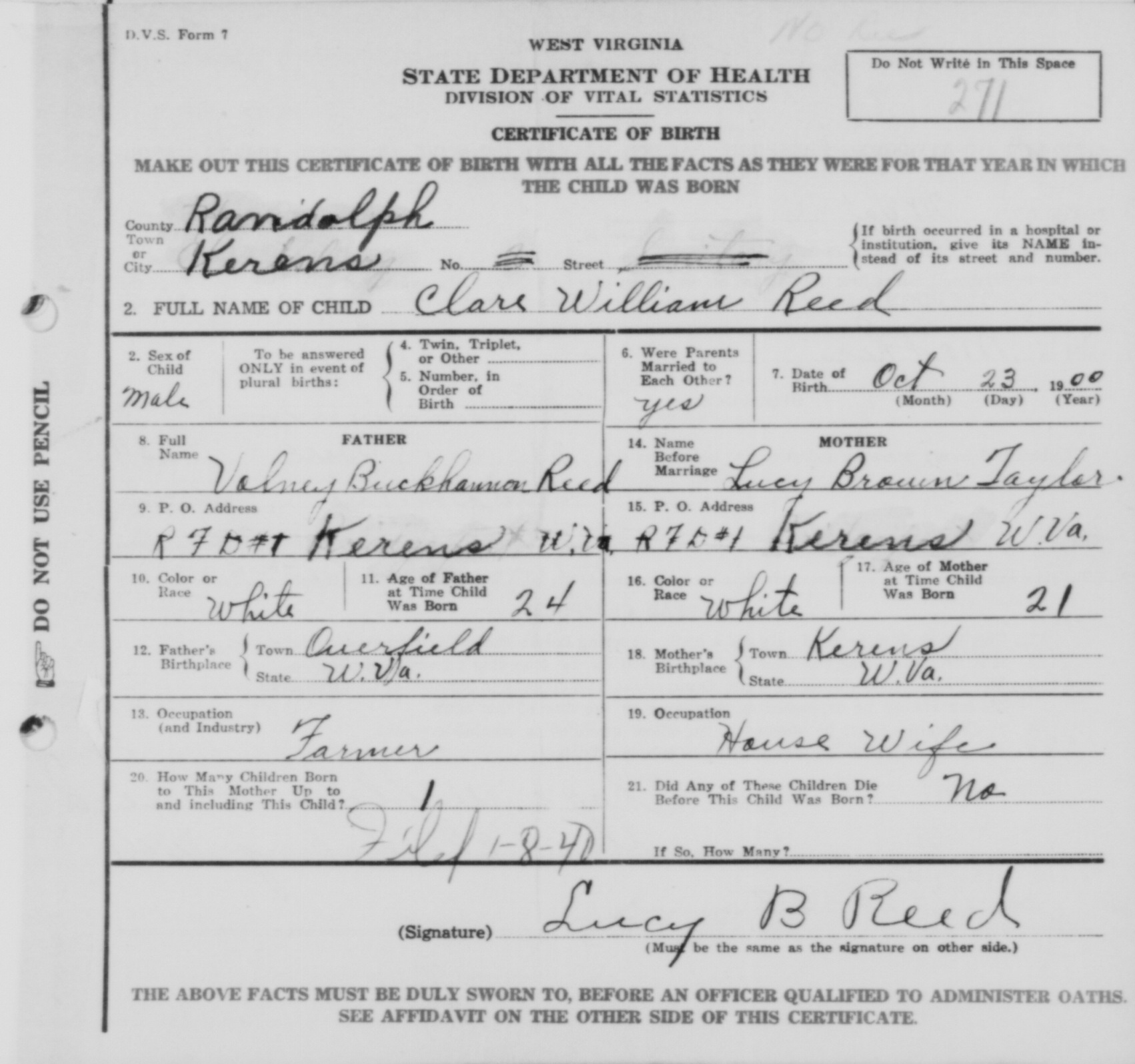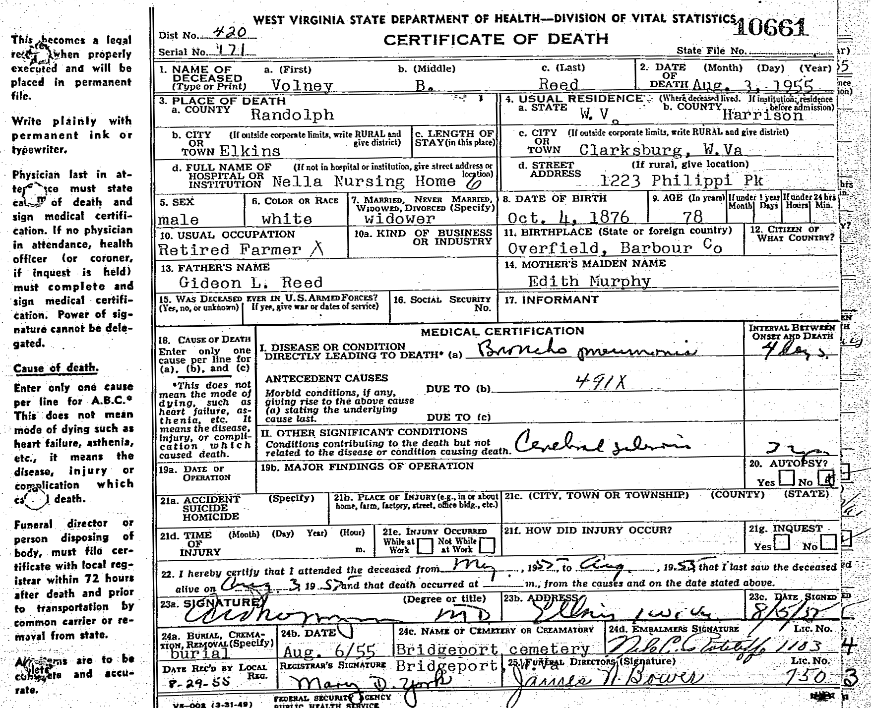 ( b. Oct 4, 1876, Overfield, Barbour Co., WV, son of Gideon L Reed and