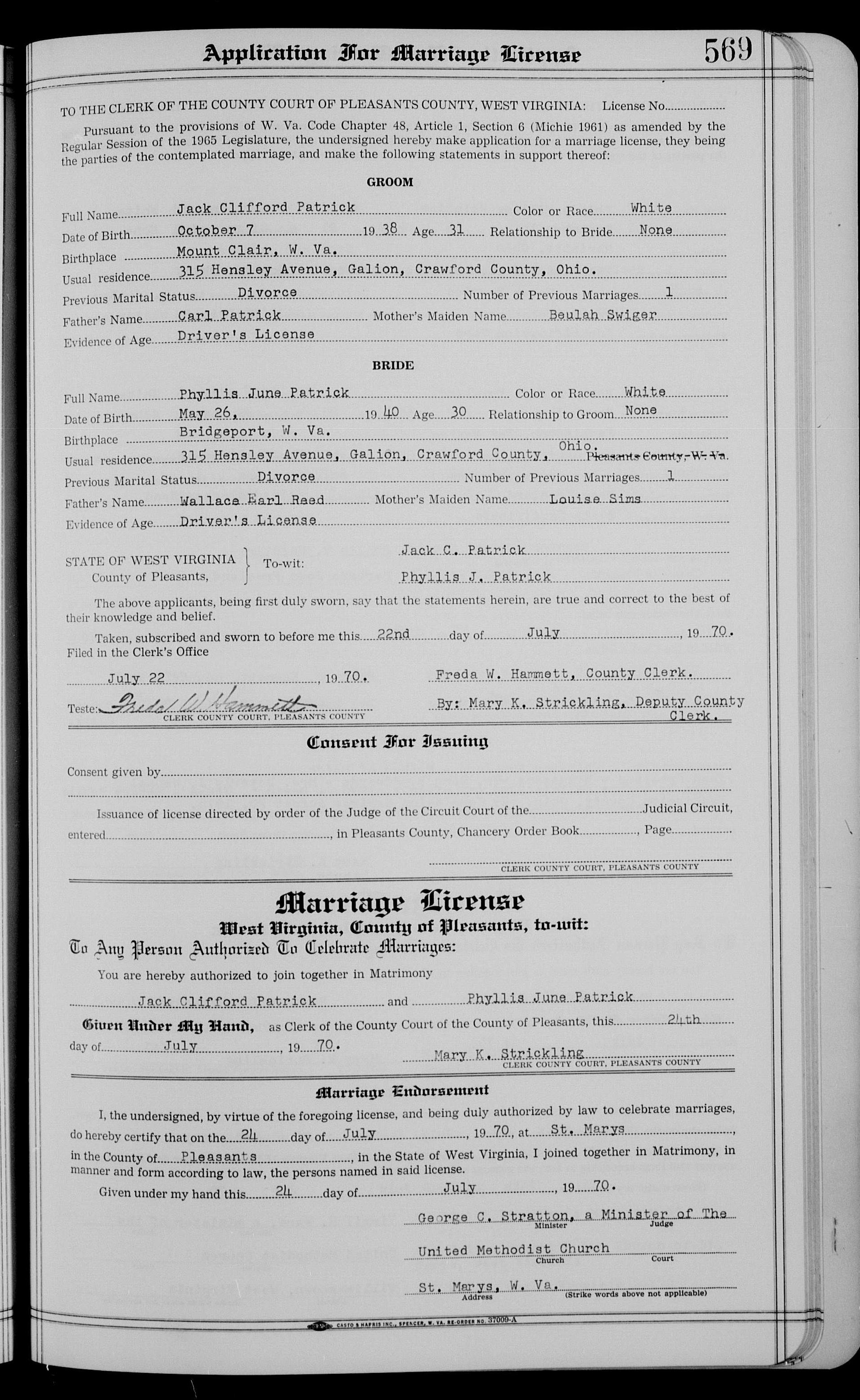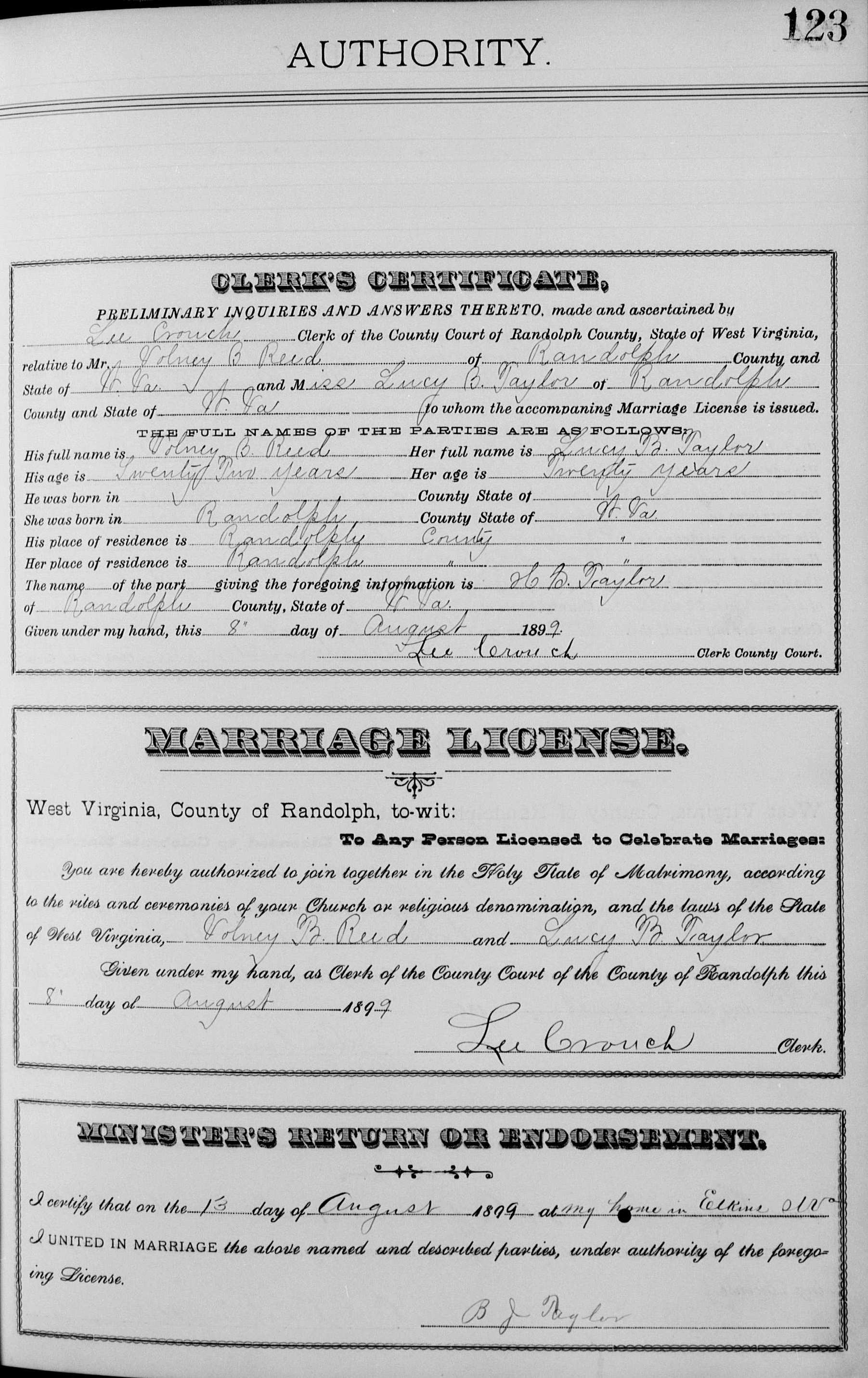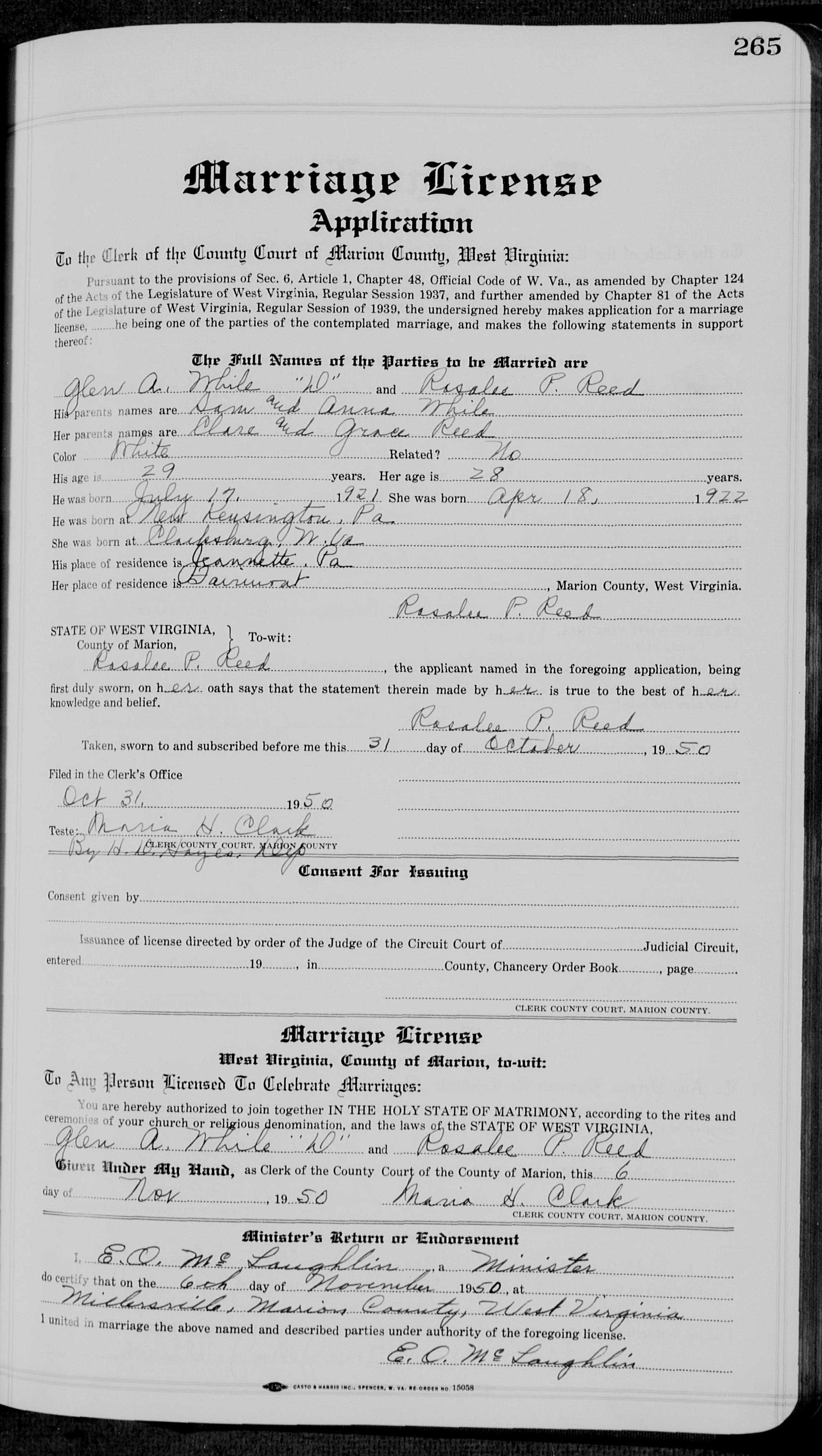 license with Nellie, it says he was single.) - April 8, 1950, Lost Creek, Harrison Co.,